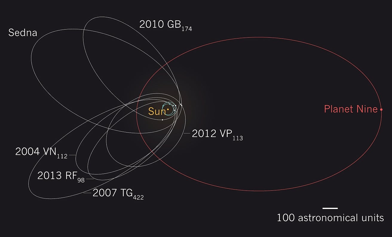 Die Geschichte von Planet Neun begann 2014, als zwei Astronomen vom Fund des KBO 2012 VP113 berichteten. Seine ausgedehnte Umlaufbahn bringt ihn nie näher als 80 AE an die Sonne. An seinem am weitesten entfernten Punkt beträgt der Abstand von Pluto zur Sonne 48 AE. VP113 folgte dem Zwergplaneten Sedna als zweites bekanntes Objekt mit derart ferner Umlaufbahn. In ihrem Bericht folgerten Chadwick Trujillo vom Gemini Observatory in Hilo, Hawaii, und Scott Sheppard von der Carnegie Institution for Science in Washington D. C., dass die Bahnen dieser Himmelskörper noch ein weiteres Objekt nahelegten, das größer als die Erde sei und bei 250 AE vorhanden sein könnte.Batygin und Brown nahmen die Herausforderung an. "Unser wichtigstes Ziel war es eigentlich zu zeigen, dass diese Idee verrückt ist", sagt Brown. Aber Trujillo und Sheppard wiesen daraufhin, dass Sedna, VP113 und mehrere andere KBO alle eine auffällige Eigenschaft teilten: Ihre dichteste Annäherung an die Sonne fand in der Ebene des Sonnensystems statt. Und sie bewegten sich alle von Süd nach Nord, wenn sie diese Ebene durchquerten.