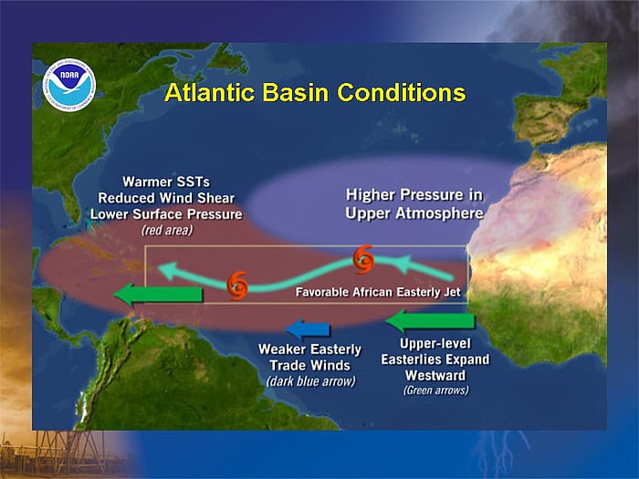 Entstehungshilfen für Hurrikane | Gegenwärtig herrschen im Atlantik Bedingungen, die die Entstehung von Hurrikanen begünstigen – etwa erhöhte Wassertemperaturen, hoher Luftdruck in höheren Atmosphärenschichten und häufige Wellenstörungen in der Luftbewegung.