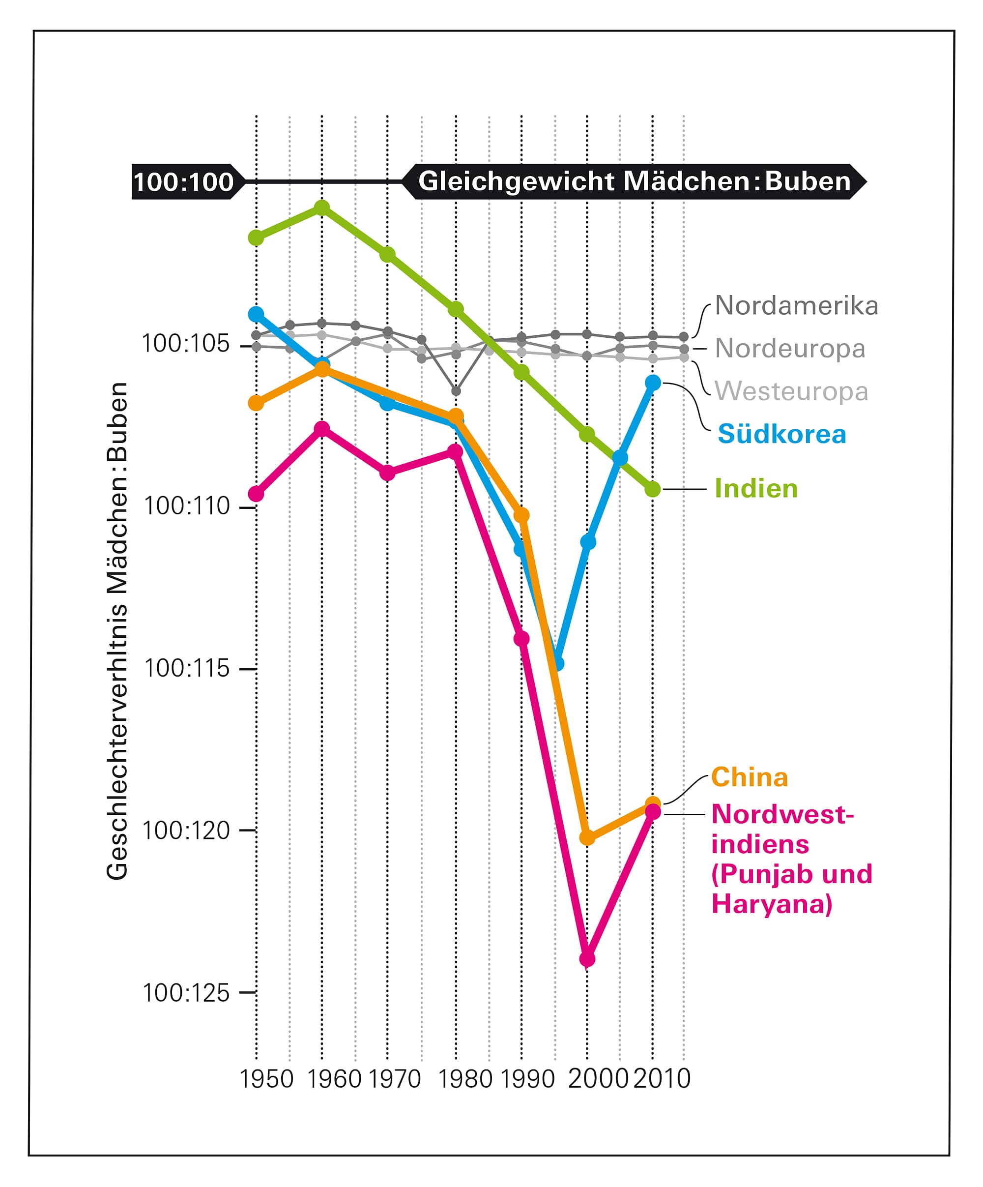 Doch seit Kurzem gerät Bewegung ins demografische Ungleichgewicht. In Südkorea hat sich der einst große Überschuss männlicher Nachkommen seit Mitte der 1990er Jahre nicht nur normalisiert, sondern schlägt tendenziell sogar in eine Präferenz für Töchter um. In Indien zeigt die Volkszählung von 2011 für den Nordwesten einen deutlichen Rückgang des dort besonders krassen Missverhältnisses zwischen Mädchen und Jungen. Auch in China hat sich der starke Trend zur Bevorzugung männlicher Babys abgeschwächt.