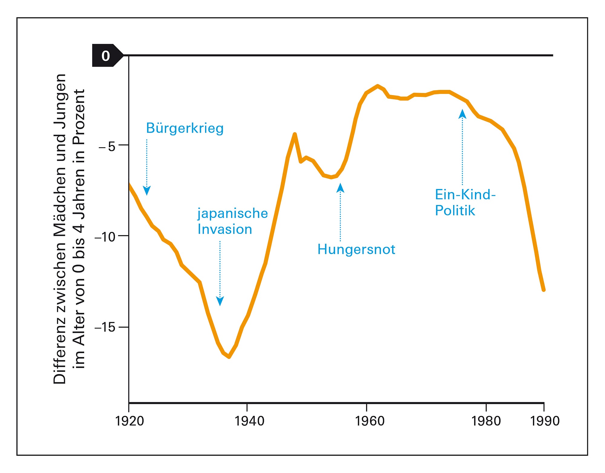 Hungersnöte und Kriege erhöhen den Drang, vermeintlich überflüssige Kinder loszuwerden. Als japanische Truppen 1937 den Osten Chinas überfielen, stieg die Sterberate der Mädchen um 17 Prozent gegenüber für solche Zeiten zu erwartende Werte. Die Eltern in Kriegsgebieten standen vor schweren Entscheidungen. In der Provinz Zhejiang erzählte mir eine Frau, was sie in den 1930er Jahren erlebt hatte: "Ich war sechs Jahre alt, als meine Mutter sagte, ich müsse verkauft werden. Ich flehte meinen Vater an, mich zu behalten. Ich versprach, ganz wenig zu essen, wenn ich bleiben durfte." Ähnlich wirkt sich der Zusammenbruch von Regierungen aus. In den Ländern des südlichen Kaukasus kamen nach dem Ende der Sowjetunion plötzlich viel mehr Jungen als Mädchen zur Welt.