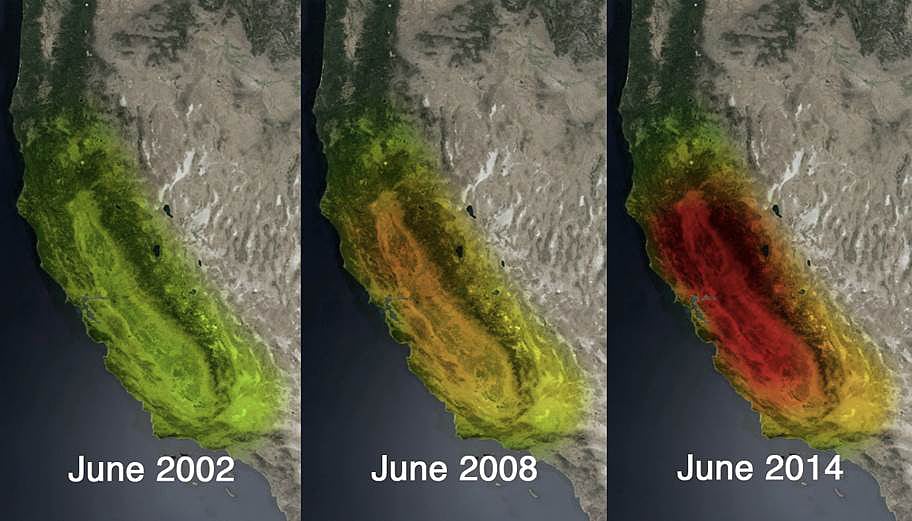 Damals wie heute verhinderte während des vorangegangenen Winters über dem amerikanischen Westen ein Hochdruckrücken – ein stationäres und deutlich in die Atmosphäre aufragendes Hoch –, dass regenschwere Tiefdruckgebiete das Festland erreichen. Während dieser Jahreszeit fällt jedoch normalerweise der meiste Niederschlag, der in den regionalen Gebirgen wie der Sierra Nevada als Schnee niedergeht. Die Berge dienen dabei als so genannte Wassertürme, die das Wasser im Lauf der Schneeschmelze nach und nach an die Flüsse abgeben; oder es wird in Reservoirs gespeichert. Der letzte Winter war dagegen ausgesprochen schneearm, wie unter anderem Satellitenbilder zeigen. Weder unterirdische Aquifer noch oberirdische Stauseen wurden aufgefüllt, weshalb bei dem anhaltend hohen Konsum in Kalifornien zusammen mit der starken sommerlichen Verdunstung das verbliebene Wasser rasch übernutzt wurde. Während der Sommermonate liegt Kalifornien ohnehin unter starkem Hochdruckeinfluss, so dass hier teilweise über Wochen hinweg kaum weiterer Regen fällt.