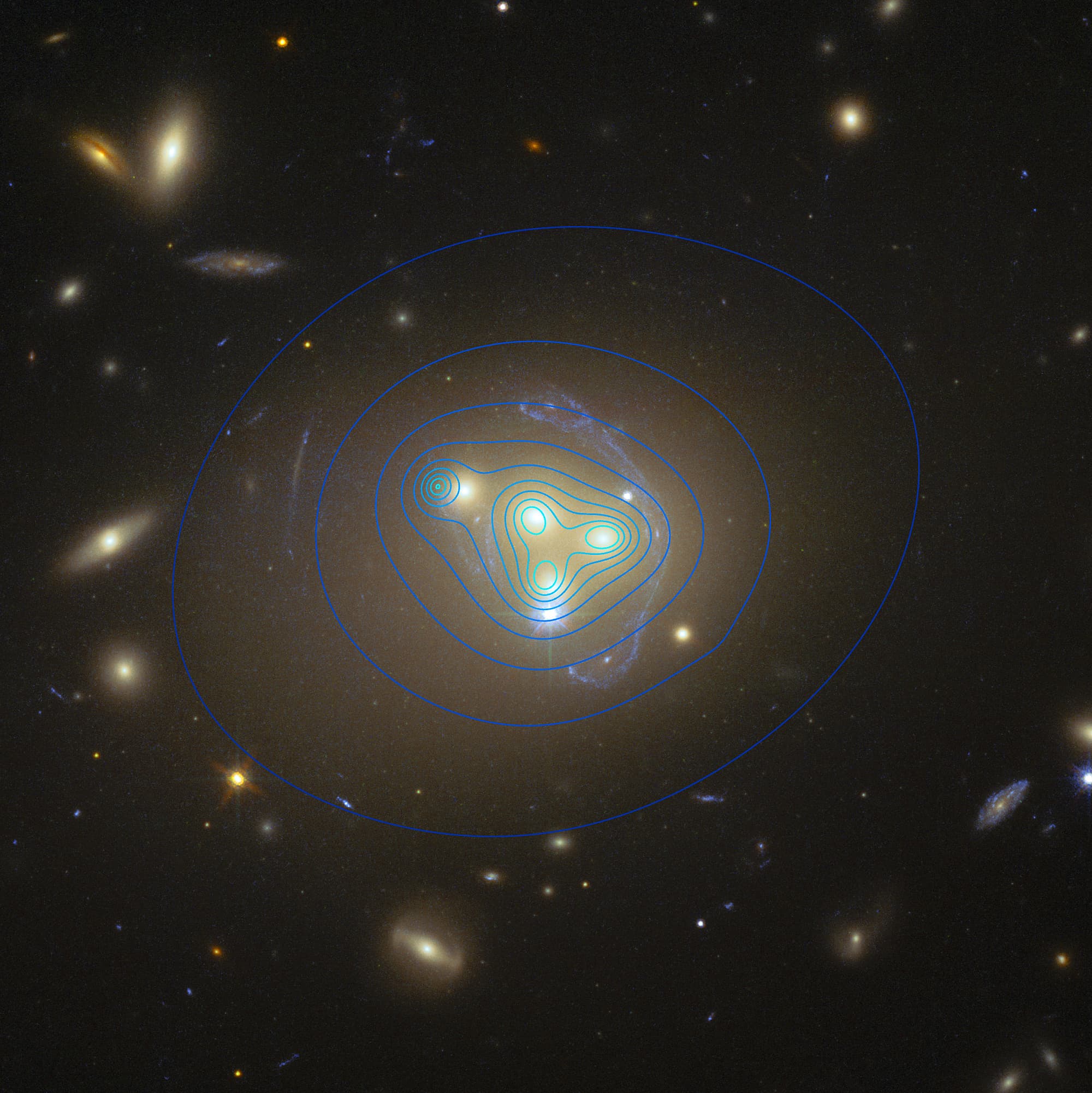 Präzise astronomische Beobachtungen sollen Wissenschaftlern helfen, zwischen den konkurrierenden Annahmen über Art und Zusammensetzung Dunkler Materie zu entscheiden, so zum Beispiel durch Vermessung des Galaxienhaufens Abell 3827. Diese Ansammlung elliptischer Galaxien ist für ihre große Masse bekannt und eignet sich deshalb besonders gut für die Analyse Dunkler Materie. Abell 3827 liegt in rund 1,4 Milliarden Lichtjahren Entfernung. Auf engem Raum kollidieren dort gleich vier Galaxien miteinander.