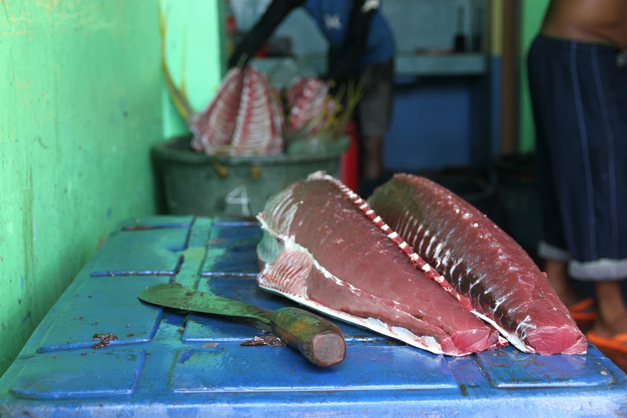 Davon ist der 42,5-Kilo-Koloss, der sich in Ernesto Buasans Haken verbiss, weit entfernt. Er war der zweitgrößte Thunfisch, den Flordeliza Barasona in ihrer Casa einem Fischer heute Morgen abgekauft hat. Die 59-Jährige schreibt sorgfältig ein paar Zahlen in das rote Ringbuch und reicht Buasan den Taschenrechner, damit er die Ziffern auf dem Display sehen kann. Der Fischer lächelt erleichtert und bedankt sich: 9775 Pesos bietet sie ihm für seinen Thunfisch an, das sind umgerechnet knapp 169 Euro. Dazu noch einmal 500 Pesos – 8,70 Euro – für jede der beiden Goldmakrelen.