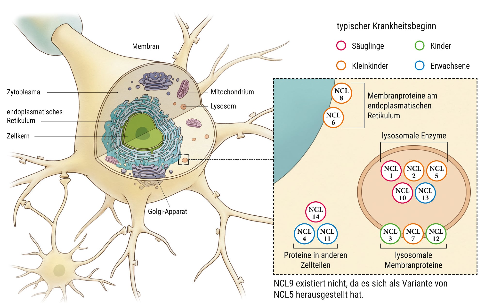 Warum die Nerven- und Netzhautzellen der jungen Patienten absterben, haben Forscher noch nicht abschließend geklärt. Sicher ist, dass bestimmte Zellbestandteile dabei eine zentrale Rolle spielen: die Lysosomen. Die mit Enzymen und Säure gefüllten Bläschen sind so etwas wie winzige Recyclinghöfe. Sie zerlegen sowohl zelleigenen Abfall als auch Material, das von außen in die Zelle gelangt ist, in seine molekularen Bestandteile. Diese kann die Zelle wiederverwenden, zum Beispiel um neue Proteine zu bilden oder um Energie zu gewinnen. Von den 13 NCL-Genen enthalten fünf den Bauplan für jeweils ein lysosomales Enzym. Ist die Anleitung fehlerhaft, kann die Zelle es nur falsch oder überhaupt nicht herstellen. Drei weitere codieren für Proteine in der Hülle der Lysosomen. Ohne sie können die Bläschen nicht mit zellulären »Abfallkapseln« verschmelzen und deren Ladung in sich aufnehmen. Als Konsequenz sammelt sich Müll zusehends in der Zelle an und schadet ihr möglicherweise.