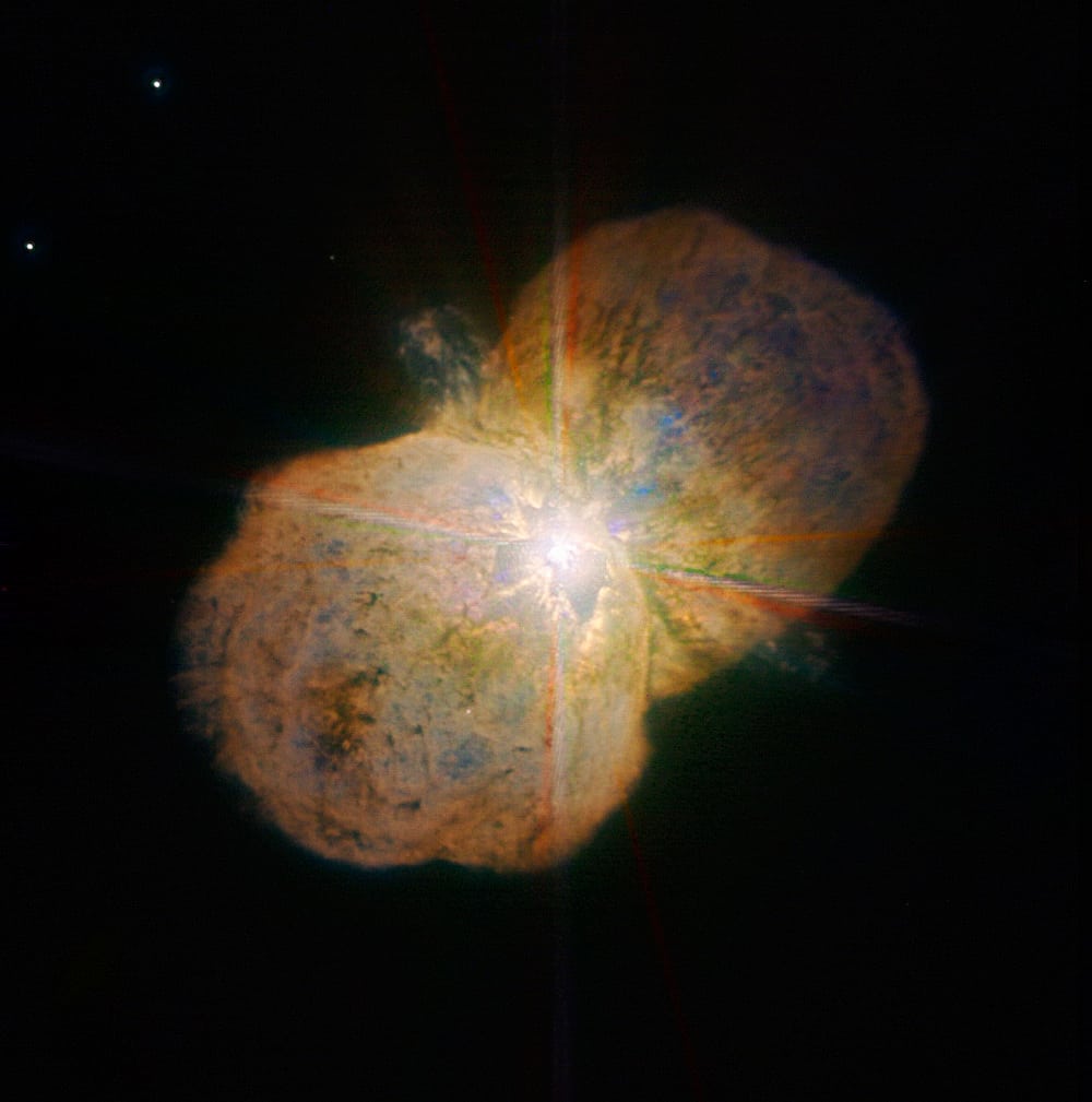 Die meisten Astrophysiker gehen jedoch davon aus, dass Eta Carinae gar keinen Gammastrahlenausbruch hervorrufen wird – und falls doch, würde die Erde nicht in der Schusslinie liegen. Und selbst wenn einer der Jets unseren Planeten träfe, bliebe noch Grund zur Hoffnung. Denn vorausgesetzt der Gammablitz wäre von durchschnittlicher Helligkeit, würde seine Strahlung über die 7500 Lichtjahre lange Distanz zu sehr abgeschwächt, um der Biosphäre ernsthaft zu schaden. Gemäß diesem Szenario dürfte das Ableben von Eta Carinae dann auch recht unspektakulär ausfallen: Der Stern leuchtet am Nachthimmel kurzzeitig so hell auf wie der Vollmond, bevor er allmählich verblasst.
