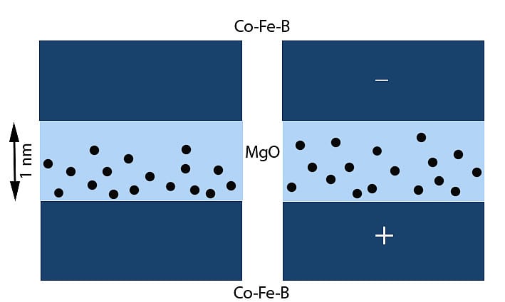 Aber mit dem Memristor der Bielefelder Forscher könnte sich sogar noch mehr anfangen lassen als nur synaptisches Lernen. Ab einer bestimmten Stromstärke nämlich beginnt er wie ein Neuron zu feuern. Verantwortlich dafür ist ein noch nicht in allen Details verstandener quantenmechanischer Effekt, der durch die magnetischen Elektroden auf den Stromfluss ausgelöst wird. Klassisch gesehen dürfte durch die Isolierschicht gar kein Strom fließen, der so genannte Tunneleffekt sorgt jedoch dafür, dass Elektronen mit einer bestimmten Wahrscheinlichkeit die Isolierschicht durchqueren können. Da die Elektronen auf Grund ihres Eigendrehimpulses (Spin) ein magnetisches Moment haben, hängt die Tunnelwahrscheinlichkeit von der Polung der magnetischen Elektroden ab. Sie ist höher, wenn die Elektroden gleichsinnig gepolt sind, der resultierende Tunnelstrom wird stärker.