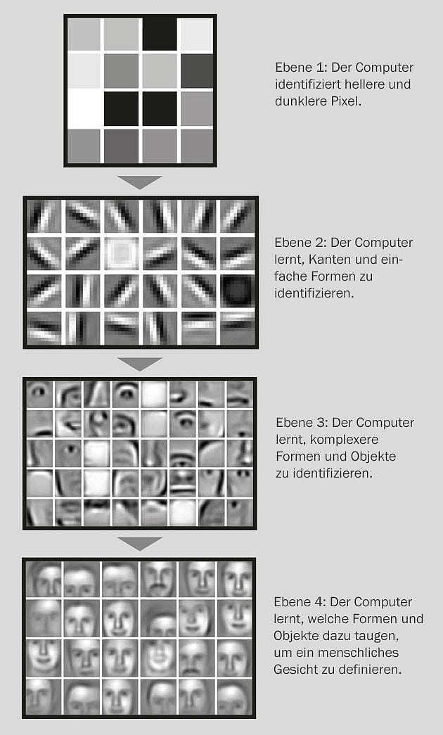 Im Wesentlichen sieht der Ansatz vor, künstliche Neurone in mehrere Ebenen einzuteilen. Gilt es beispielsweise ein Bild zu erkennen, registrierten etwa die Einheiten der ersten Ebene lediglich Helligkeitswerte der Pixel. Die nächste Ebene wiederum würde erkennen, dass einige der Pixel zu Kanten verbunden sind, woraufhin die darauffolgende zwischen horizontalen und vertikalen Linien unterscheidet - und so weiter, bis schließlich eine Ebene erreicht wird, in der die Neurone Augen auseinanderhalten können, und das System weiß, dass in einem Gesicht typischerweise zwei davon auftauchen.