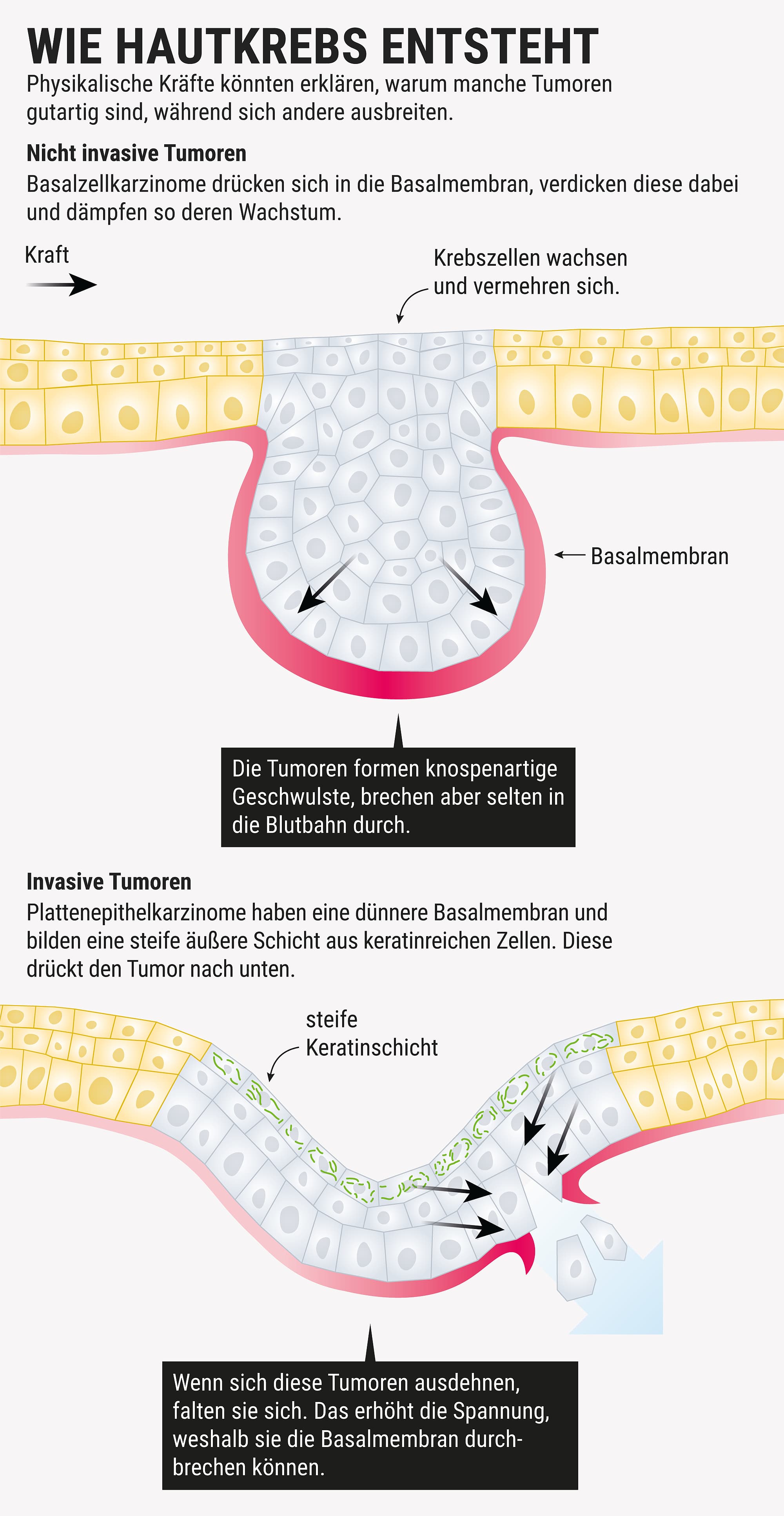 Bei der Arbeit mit Haut von Mäusen entdeckten die Stammzellbiologen Elaine Fuchs und Vincent Fiore, dass der gutartige Krebs eine dickere, weichere Basalmembran bildete, die die Tumorzellen wie ein Handschuh umschloss, wenn sie nach unten drückten. Der aggressive Tumor hingegen förderte eine dünnere Basalmembran. Auch eine Kraft von oben half den invasiven Tumoren: Plattenepithelkarzinome bilden eine steife Schicht aus differenzierten Hautzellen, die Keratinperle. Indem sie auf die Spitze des Karzinoms drückt, hilft die Perle dem Tumor, durch die fragile Basalmembran zu brechen wie eine Faust durch Glas.