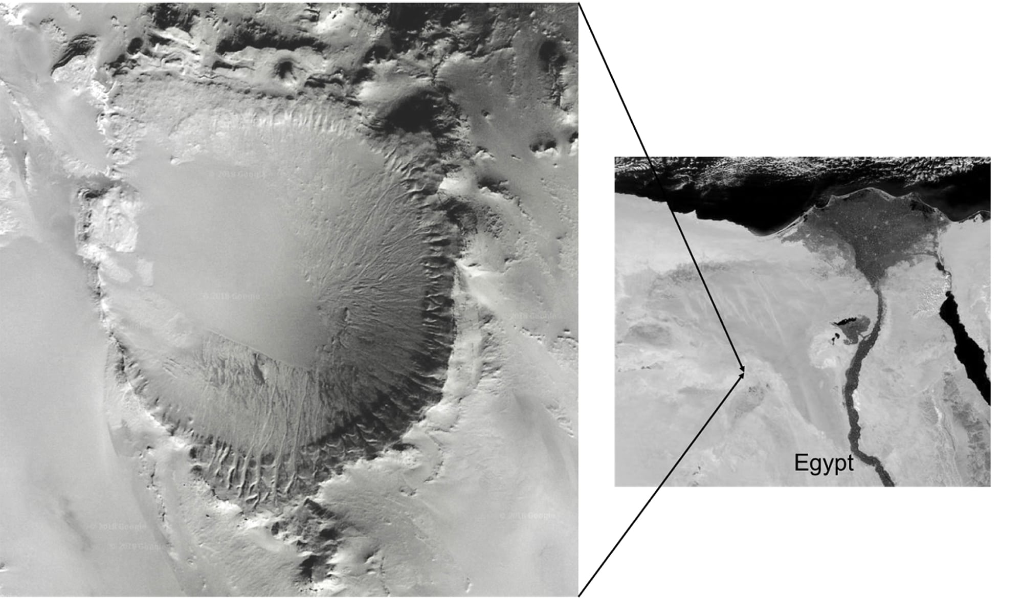 Bei einer Analyse von Satellitenbildern von der Sahara zwischen Qaret Had El Bahr und Qaret El Allafa in Ägypten entdeckten Forscher einen bislang nicht bekannten Krater. Die Struktur hat einen Durchmesser von 327 Metern, einen Rand mit einem Umfang von rund 1000 Metern und eine Fläche von mehr als 80 000 Quadratmetern. Eine vorläufige spektrale und topografische Analyse zeigt charakteristische Merkmale eines Einschlagkraters – etwa einen schalenförmigen Rand und eine Kraterwand, wie die Wissenschaftler auf dem Preprint-Server arXiv.org berichten.