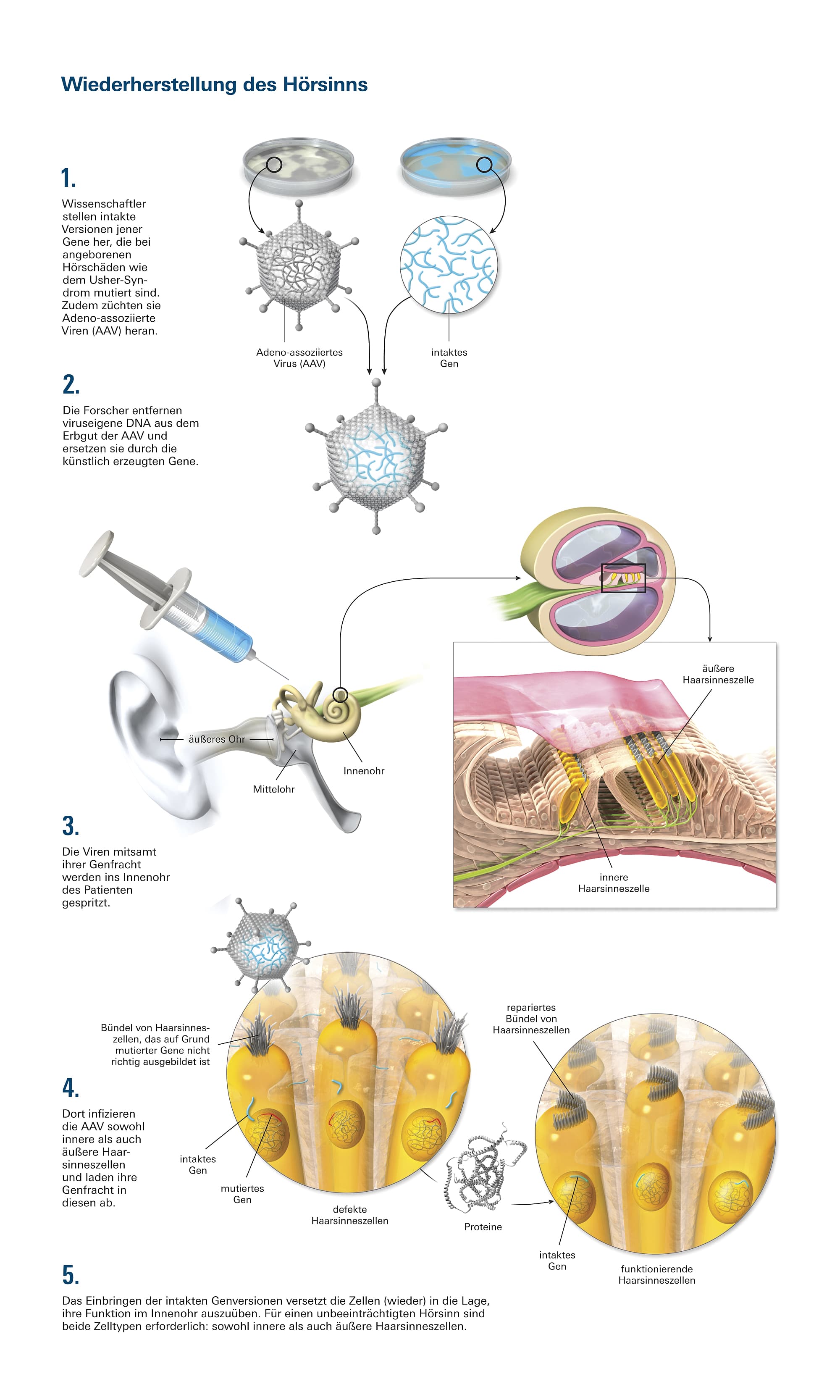 Das neu erweckte Interesse an der Gentherapie wendet sich auch der Behandlung von vererbten Hörstörungen zu. Viele meinen, zunehmende Taubheit habe vor allem mit dem Älterwerden oder mit Unfällen zu tun, doch gehören Hörschäden zu den häufigsten Geburtsdefekten beim Menschen; sie betreffen etwa 3 von 1000 Neugeborenen. Genveränderungen zeichnen für mehr als die Hälfte davon verantwortlich – einschließlich des Usher-Syndroms. Diese Krankheit bietet sich als Ziel für Gentherapien besonders an, da die Patienten Mutationen in einzelnen Genen tragen, deren funktionaler Ersatz die Krankheitsursache und damit auch die Symptome beheben sollte. Bestimmte Typen der Erkrankung – etwa jener, unter dem Corderman leidet – schreiten relativ langsam fort, was ein Zeitfenster nach der Diagnose eröffnet, in dem sich die genetisch bedingte Schädigung stoppen lässt. Der zunehmende Funktionsverlust betrifft unter anderem die Haarsinneszellen im Innenohr, die normalerweise von außen eintreffende Schallwellen in Nervensignale umwandeln, welche sie ans Gehirn weiterleiten. Bei Corderman und anderen vom Usher-Syndrom Betroffenen sorgen defekte Gene dafür, dass die Haarsinneszellen nicht mehr richtig funktionieren.