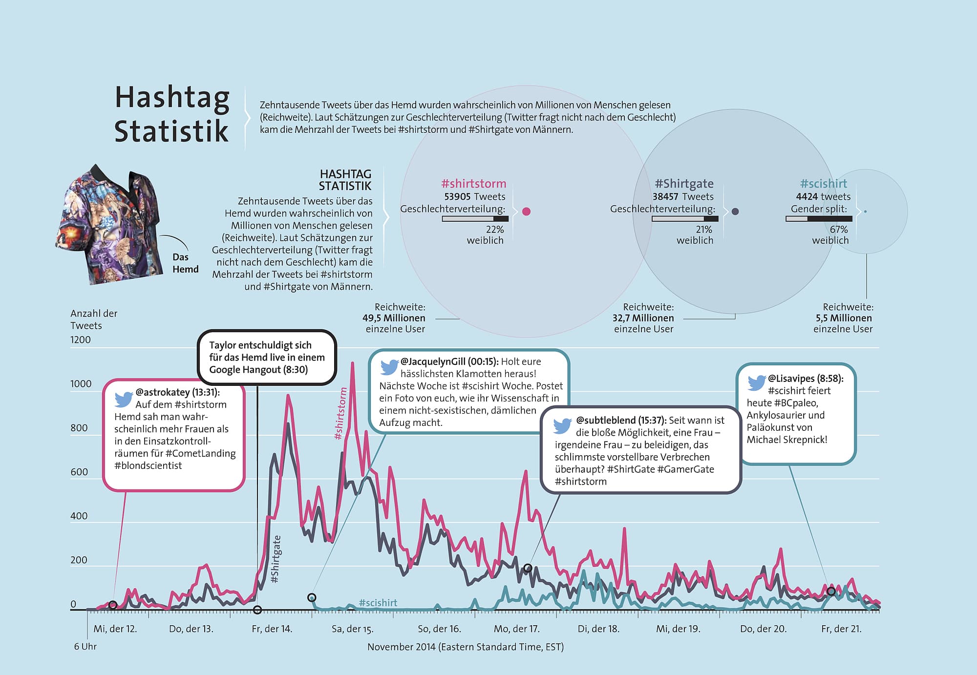 — Fernanda Foertter (@hpcprogrammer) 12. November 2014Äußerungen zum Thema Sexismus wie in #shirtstorm und anderen Twitter-Nachrichten sind gar nicht neu, lediglich der Ort hat sich geändert, erklärt die Geobiologin Hope Jahren von der University of Hawaii in Manoa, die selbst auf Twitter aktiv ist. »Typen haben schon immer diese Hemden mit Mädchenbildern getragen«, meint sie. »Die Frauen um sie herum haben dann die Augen gerollt, sind nach Hause gegangen und haben sich gesagt: Was für ein Idiot, so ein Dreck. Das haben sie auch auf der Damentoilette und im Aufenthaltsraum gesagt - und nun tun sie es eben auf Twitter«, sagt Jahren.
