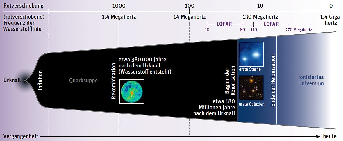 Etwa 100 Millionen Jahre nach dem Urknall gab es nur Wolken aus Wasserstoff, ein wenig Helium und Spuren von Lithium. Hinzu kam die Mikrowellenstrahlung des kosmischen Hintergrunds, das Nachglühen des einst heißen Urknalls, und natürlich die Dunkle Materie. Auch damals emittierte das Wasserstoff seine 21-Zentimeter-Strahlung. Durch die Expansion des Universums erreicht uns diese Strahlung heute allerdings nicht mit ihrer Ruhefrequenz von 1420 MHz, sondern ist stark rotverschoben. Für die Strahlung aus dem Zeitalter der Reionisation, die Kosmologen zwischen 100 und 300 Millionen Jahre nach dem Urknall vermuten, ergeben sich Frequenzen zwischen 50 und 200 MHz. Das sind typische Radiofrequenzen, die schon mit einfachen Empfängern registriert werden können.