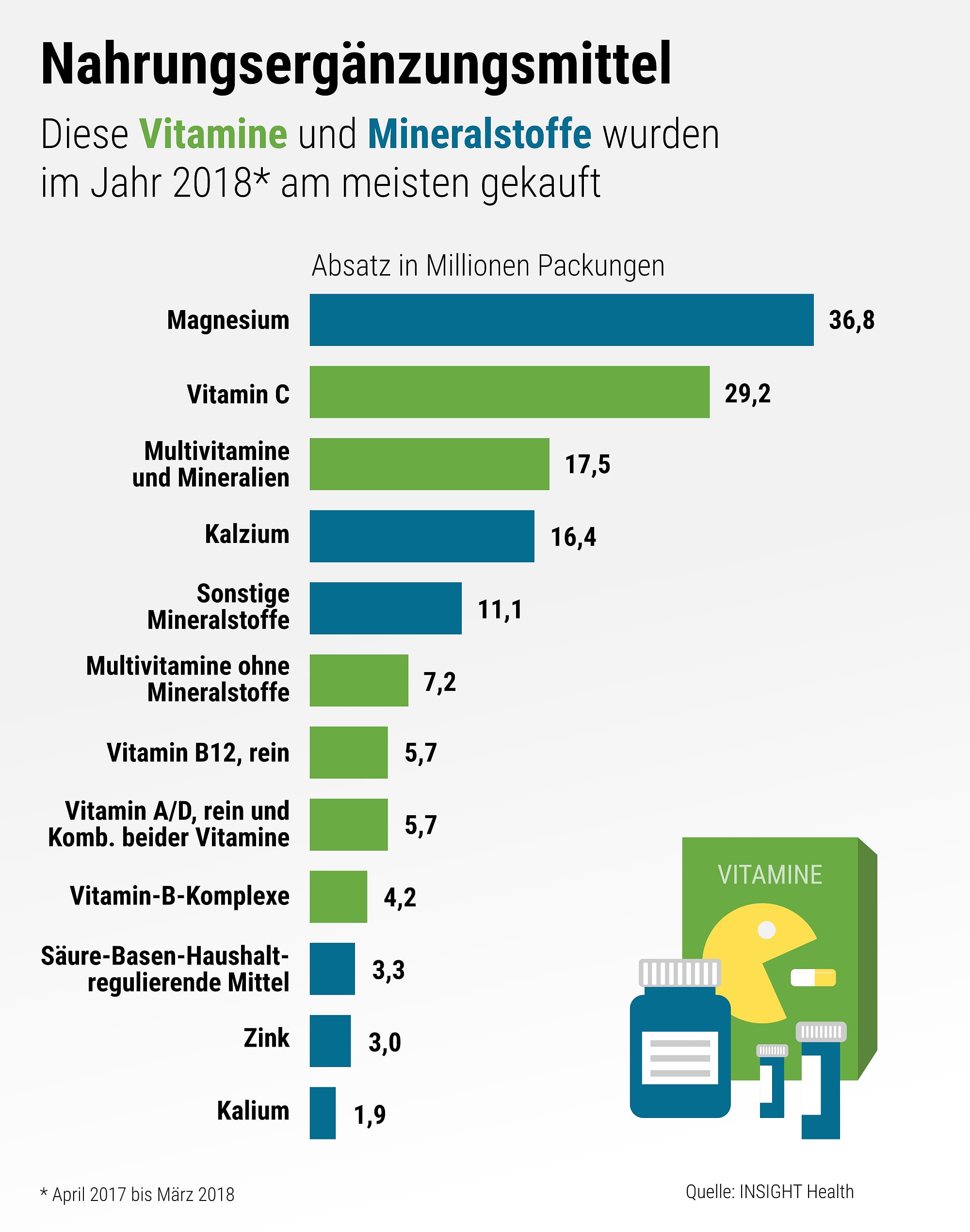 Hinter den Nahrungsergänzungsmitteln, die in den Regalen von Deutschlands Supermärkten, Apotheken, Drogerien und Reformhäusern auf Kundschaft warten, steckt ein Milliardenmarkt: Vitamine, Mineralstoffe, Pflanzenextrakte und Mikronährstoffe generierten 2018 beeindruckende 1,44 Milliarden Euro Umsatz – 130 Millionen Euro mehr als im Jahr zuvor. Zum Vergleich: Das Marktvolumen für frisches Obst und Gemüse lag im selben Jahr bei 14,8 Milliarden Euro. Allein im Jahr 2018 wurden rund 225 Millionen Packungen Nahrungsergänzungsmittel verkauft – so viele wie noch nie zuvor, zwölf Millionen mehr als noch 2017. Jedes Jahr kommen allein in Deutschland 5000 bis 6000 neue Produkte auf den Markt, den die Corona-Pandemie laut ZDF-Informationen in den vergangenen Monaten weiter befeuert haben soll.