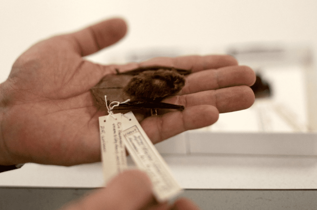 In einem Raum tief im Inneren der Smithsonian Institution in Washington D. C. schweift Ricardo Moratellis Blick über Hunderte toter Fledermäuse mit fein säuberlich gefalteten Flügeln. Reihe für Reihe geht er durch die Präparate, die akkurat wie in militärischer Formation angeordnet sind. Jedes Tier trägt am rechten Fußgelenk ein Schild, auf dem Fundort, Datum und Sammler vermerkt sind. Einige der schon vergilbten Label kennzeichnen Fledermäuse, die bereits mehr als ein Jahrhundert zur Sammlung gehören. Moratelli sucht ein kleines, gedrungenes Tier mit dunklen Flügeln und üppigem, glänzendem Fell heraus, das genau in seine Handfläche passt.