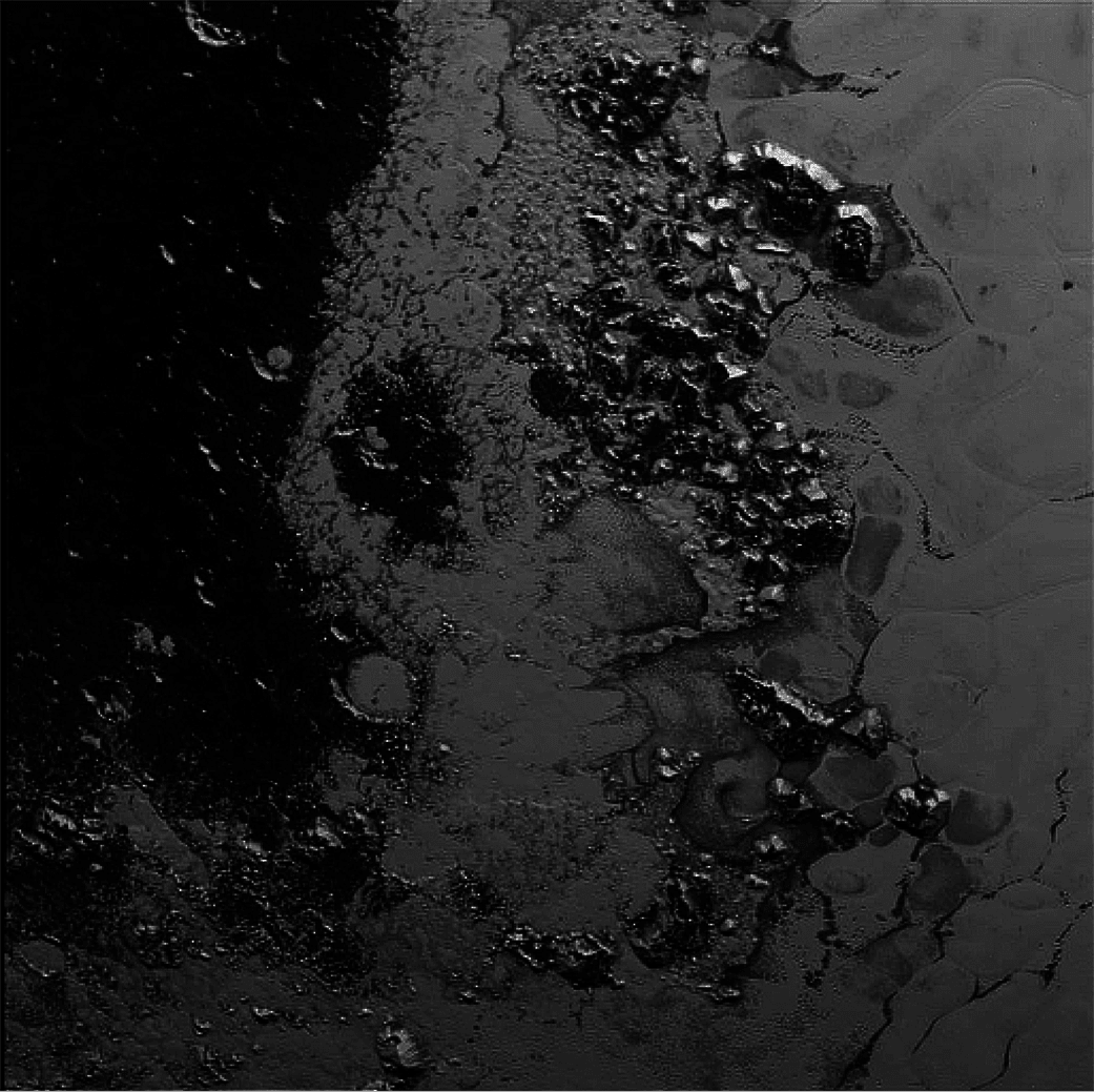 Zwei weitere Detailansichten der Plutooberfläche am westlichen Rand der hellen "Tombaugh Regio", auch Plutos Herz genannt, enthüllen die vielfältig gestaltete Oberfläche des Zwergplaneten. Eines davon ist nun die vollständige Version der am 15. Juli 2015 vorgestellten Nahaufnahme, von der seinerzeit nur ein Ausschnitt zu sehen war. Neben den schon bekannten Bergen aus Wassereis, die nun inoffiziell "Norgay Montes" genannt werden, ist die glatte Region aus Kohlenmonoxideis zu sehen, welche auf "Sputnik Planum" getauft wurde. Es zeigt sich, dass der Übergang von den Bergen zur Eisfläche sehr abrupt erfolgt. Bei näherem Hinsehen lassen sich auf der Eisfläche feine längliche Gruben erkennen. Sie könnten ein Hinweis auf Sublimationsvorgänge sein, also den direkten Übergang von Eis zu Gas.