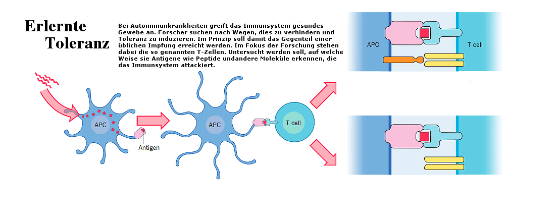 Daneben müssen die APC gewährleisten, dass die tägliche Routine des Immunsystems keinen Schaden anrichtet. Während die körpereigenen Zellen fortwährend absterben und erneuert werden, kommt es zur Entsorgung der Überreste durch die APC. Die körpereigenen Antigene (Selbstantigene) werden den T-Zellen präsentiert, allerdings zusammen mit einer Reihe von Proteinen, die Entwarnung signalisieren. Bei der Entstehung von Autoimmunität hingegen funktioniert - aus noch unbekannten Gründen - dieser Schutzmechanismus nicht mehr. Die neuen Therapien sollen diese Fehlfunktion kompensieren, indem sie die betroffenen Antigene bewusst in Gewebe schicken, in denen der Körper sie als harmlose Substanzen seiner selbst erkennt.