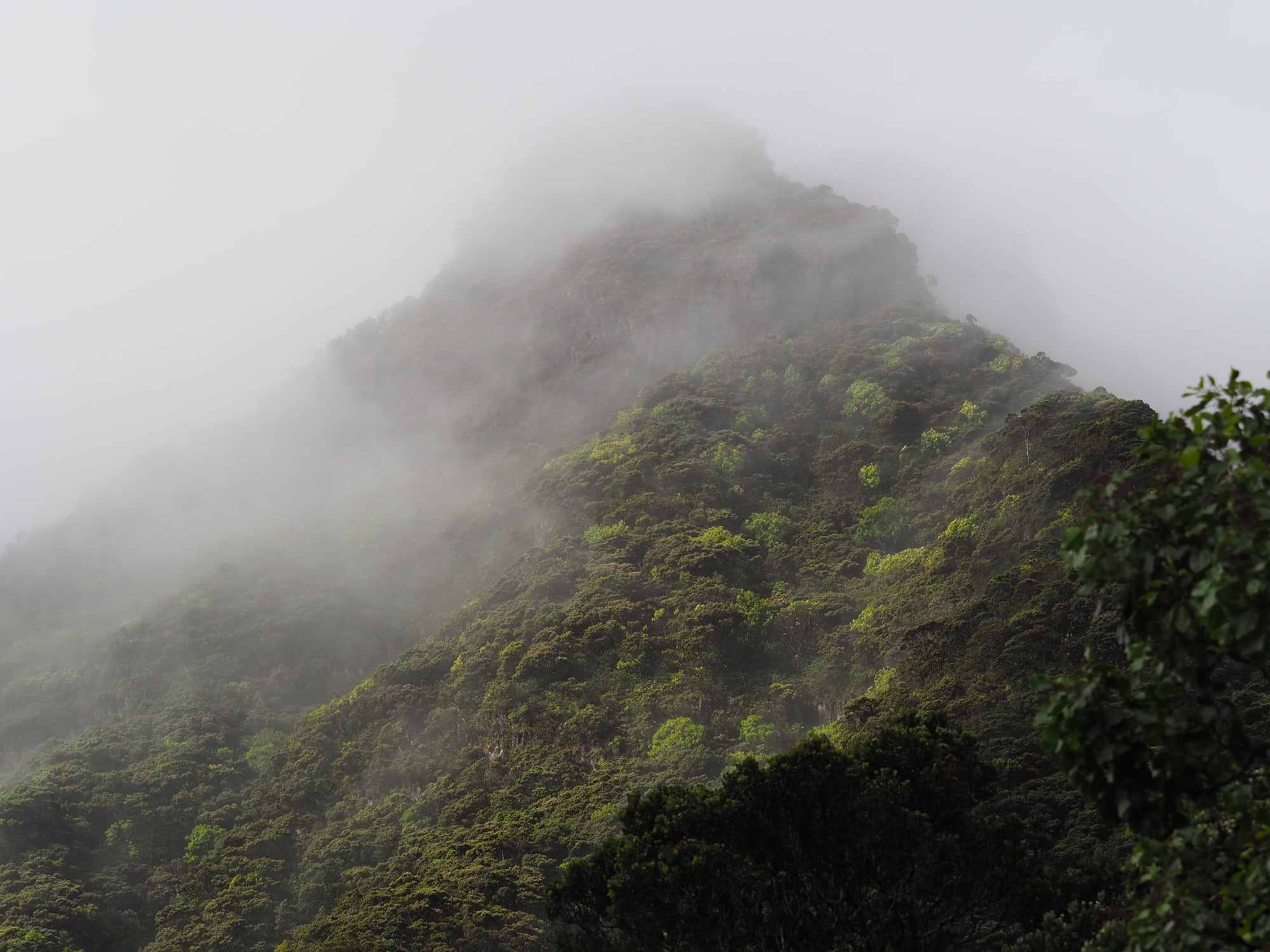 Am nächsten Tag erwachen wir eine Stunde vor Sonnenaufgang bei bewölktem Himmel und Nebel. Die feuchte Luft ist erstaunlich kühl – eine Art von Kälte, die man in einem tropischen Paradies wie Hawai'i nicht unbedingt erwartet. Wir machen uns fertig und stapfen im Schein unserer Stirnlampen durch den Wald. Unser mühsames Vorwärtskommen wird durch den Umstand erschwert, dass Jugde in diesem unberührten Teil des oberen Kipahulu-Tals nicht von seiner Machete Gebrauch macht. »Ich kann es einfach nicht«, gesteht der Forscher. »Es gibt hier so vieles, das man nirgendwo sonst findet.« Sein Verhalten hat auch wissenschaftliche Beweggründe: Das Schlagen eines Pfads bedeutet eine zusätzliche Störung für das Ökosystem, wodurch sich die Wahrscheinlichkeit erhöht, dass aggressive invasive Pflanzen dort Fuß fassen könnten.