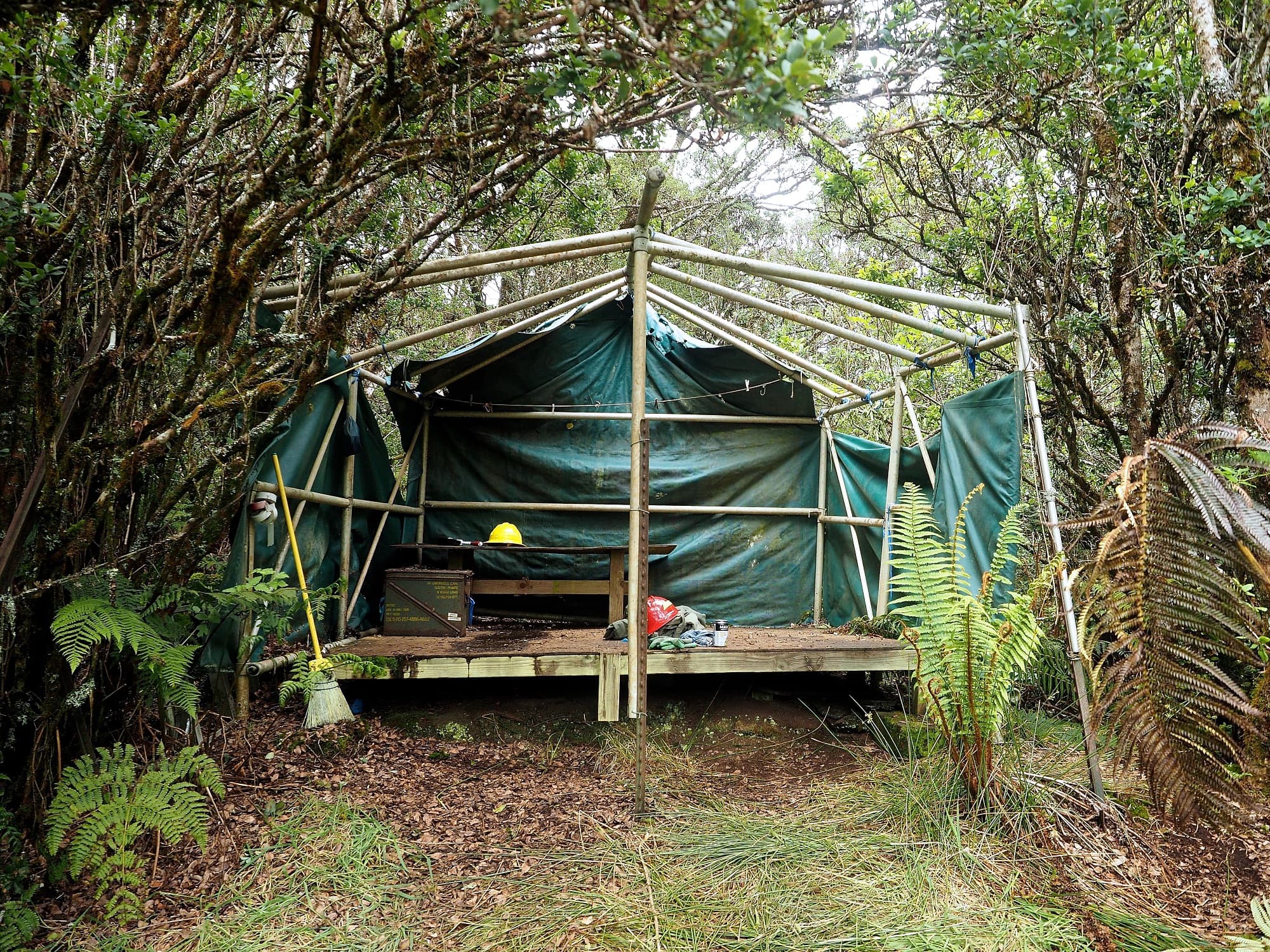 Vom Hubschrauberlandeplatz führt uns unser Weg durch dichte Bestände von 'Ohi'a (Metrosideros polymorpha) und stachelige Büschel von Pukiawe (Styphelia tameiameiae), durch deren spitzes Blattwerk Fish schon auf früheren Exkursionen stundenlang gekrochen ist. Wir schlittern über schlammiges Gelände und stoßen uns an Knien und Schienbeinen. Wir rutschen steile, dicht bewucherte Hänge hinunter und bewegen uns zentimeterweise über bemooste Felsen und verrottete Baumstämme.