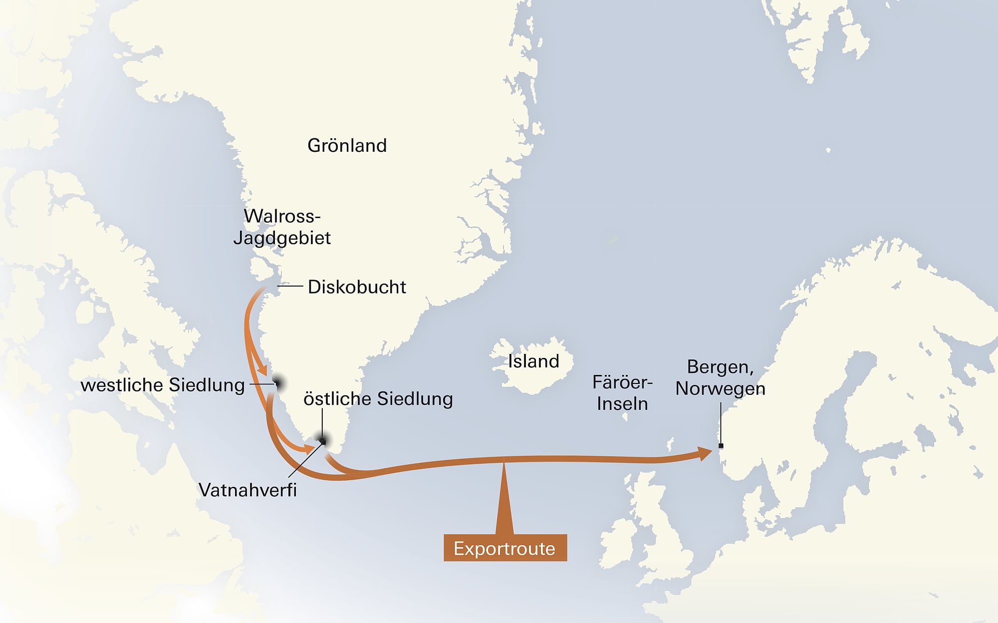 Vermutlich etliche tausend Tiere lebten in der Diskobucht an Grönlands Westküste, die von den Wikingern wohl »Nordursetur« genannt wurde, nördliches Jagdgebiet. Doch diese Region lag bis zu 800 Kilometer von den beiden Hauptsiedlungen entfernt. War die Robbenjagd bereits ein gemeinschaftliches Unternehmen, für das die Großbauern Boote stellten, galt das für das Erbeuten von Elfenbein umso mehr. Schließlich waren die Jäger einige Tage zu jener Bucht unterwegs, und danach mussten die abgetrennten Köpfe der erlegten Tiere zu den Siedlungen befördert werden. Auch die Felle der Tiere waren begehrt, weil sich daraus sehr belastbare Seile für die Seefahrt herstellen ließen. Weil die Grönländer laut Jette Arneborg unbedingt ein Handelsprodukt benötigten, um überlebenswichtige Güter zu importieren, war die Walrossjagd vielleicht neben den polaren Bedingungen ein weiterer Grund, die Stockfischproduktion im Winter weitgehend aufzugeben: Im Sommer wurden alle verfügbaren Boote und Männer für die Walrossjagd in der Diskobucht benötigt.