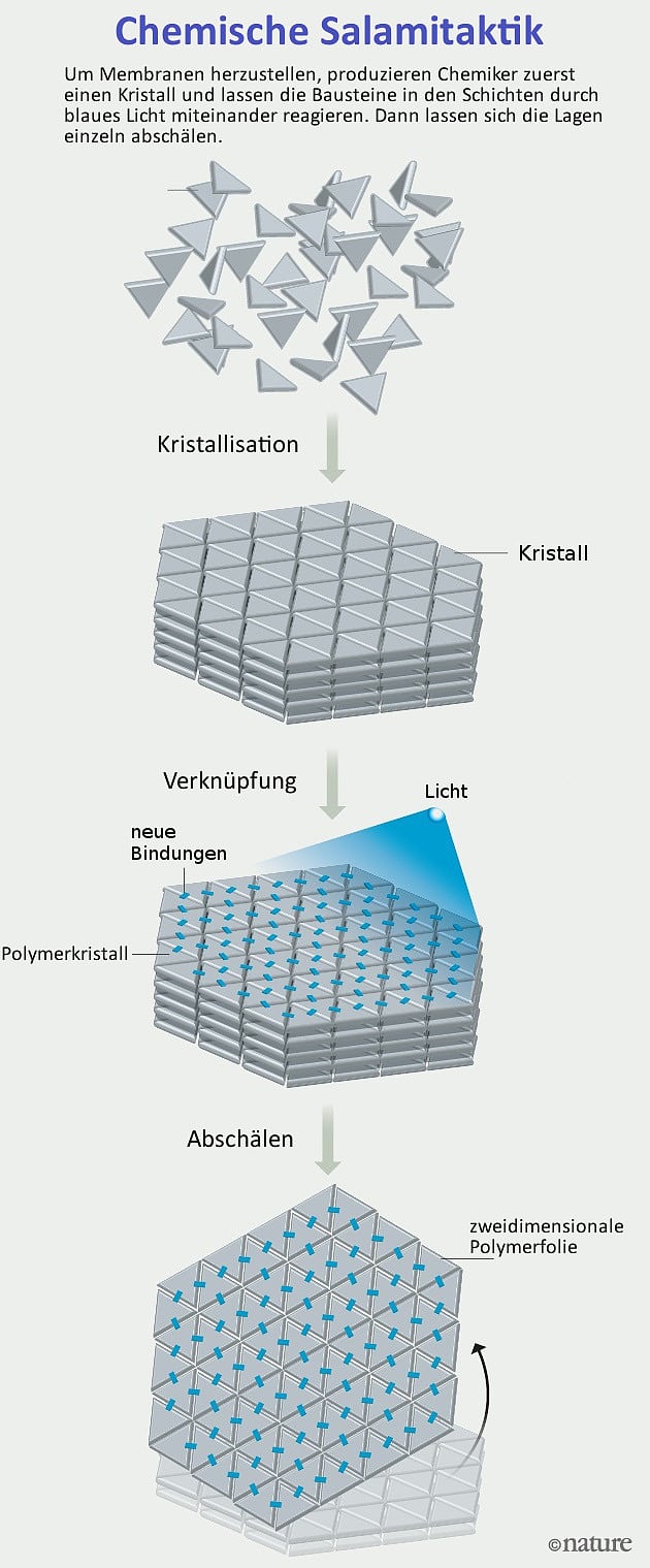 In seinen Experimenten ordnet der Forscher zunächst maßgeschneiderte Monomere zu einem geschichteten Kristall an. Anschließend löst ein blauer Lichtpuls eine chemische Reaktion zwischen den Monomeren einer Ebene aus und erzeugt so einen Kristall aus gestapelten Polymerschichten. Diese nur ein Monomer dicken Schichten lassen sich nun einzeln abziehen.