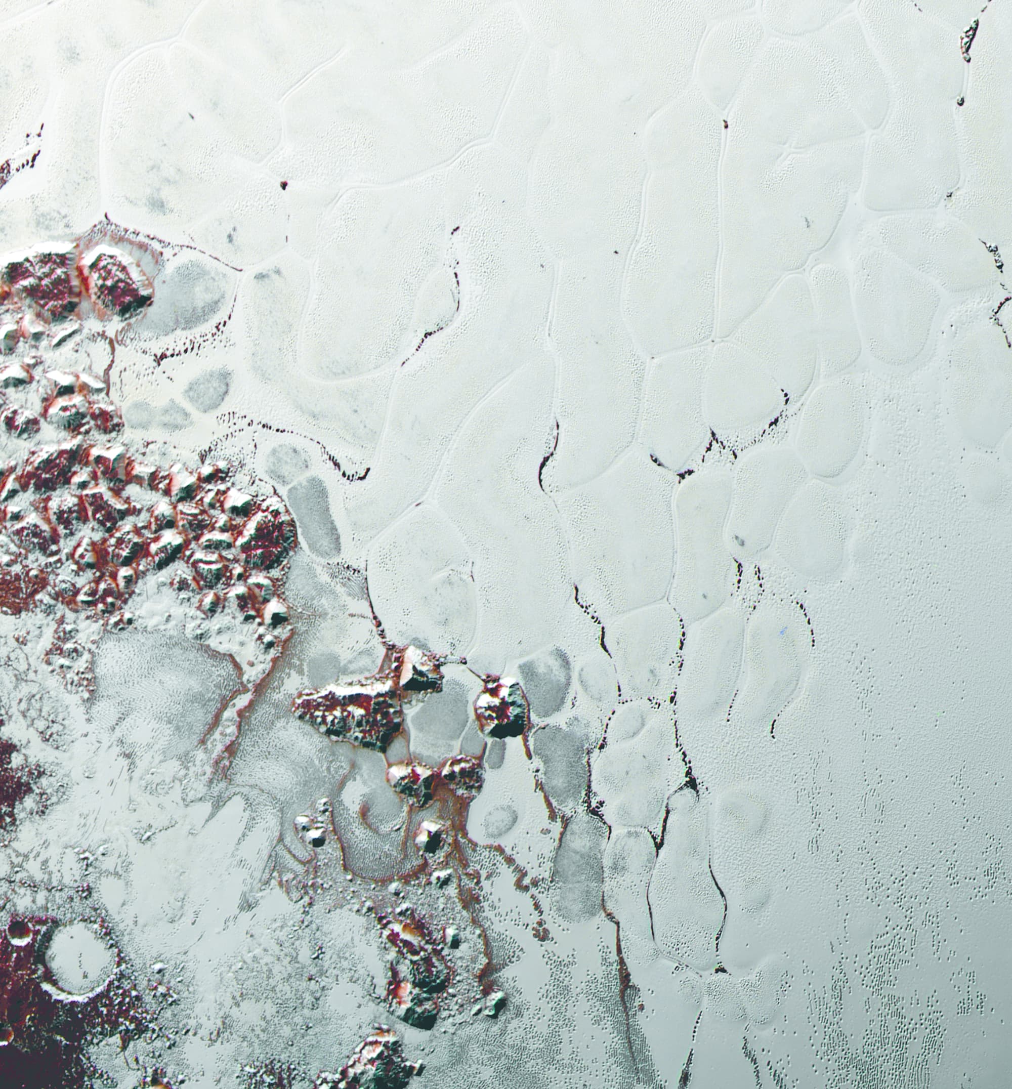 Das Auf und Nieder führt dazu, dass sich so genannte Konvektionszellen einstellen, also Bereiche, in deren Zentrum das Material aufsteigt und an deren äußeren Rändern es hinabsinkt. Sie sind auf Pluto bis zu 40 Kilometer im Durchmesser groß. Am Rand der Ebene messen sie eher 10 bis 20 Kilometer. Und dort, wo sie aneinanderstoßen, bilden sich die flachen Rillen, die das Bild der Sputnik-Ebene prägen.