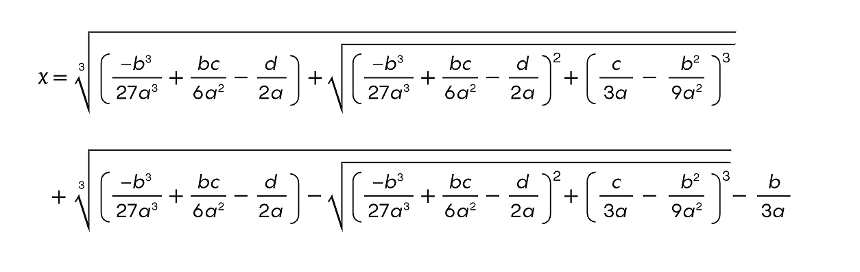 Je höher der Grad, desto unhandlicher werden die Gleichungen. In dem Buch »Ars Magna« veröffentlichte der italienische Universalgelehrte Gerolamo Cardano 1545 Formeln, welche die Nullstellen kubischer (dritter Grad) und quartischer (vierter Grad) Polynome berechnen. Die Erste lautet: