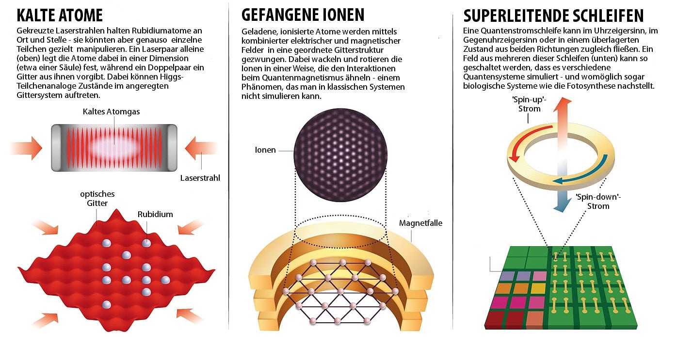 Zu jener Zeit gab es die kleinen Gitter, von denen Feynman in seinem Vortrag sprach, noch nicht. Tatsächlich dauerte es 30 Jahre, bis man die erforderliche Technologie entwickelt hatte. Denn Quantensysteme sind äußerst fragil: Nahezu jede Wechselwirkung mit der Außenwelt zerstört die empfindlichen Korrelationen. Um die Simulation störungsfrei beenden zu können, müssen die Teilchen deshalb ausreichend von ihrer Umwelt isoliert werden. Gleichzeitig muss das System interaktiv genug sein, damit die Physiker die Lösung extrahieren können. Inzwischen existieren dafür mehrere Ansätze. Blochs Gruppe nutzt neutrale Atome, andere Teams kombinieren elektrische und magnetische Felder mit Lasern, um leichtere Ionen wie Beryllium einzufangen. Bei einem dritten Verfahren werden Wirbelströme innerhalb supraleitender Mikroschaltungen kontrolliert, und ein viertes verwendet Photonen in mikroskopischen Wellenleitern (siehe "Quantenbrettspiele").