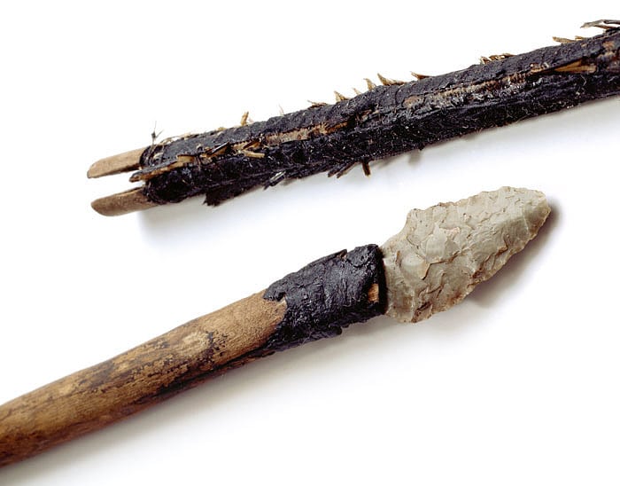 In Ötzis Köcher fanden sich neben zwölf grob bearbeiteten Schäften auch zwei schussbereite Pfeile. Sie sind knapp 90 Zentimeter lang und aus den kräftigen Ästen des Wolligen Schneeballs gefertigt. Die Feuersteinspitze wurde mit Hilfe von Birkenteer eingeklebt, dem pechähnlichen Destillat aus verschwelter Birkenrinde. Zur weiteren Sicherung diente eine Fadenumwicklung.