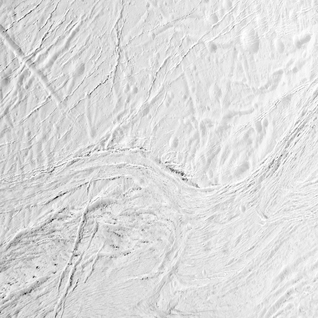 Während der Beobachtungen mit CIRS waren auch die beiden Kameras von Cassini aktiv und nahmen vor allem während des An- und Abflugs zahlreiche eindrucksvolle Bilder auf. Sie zeigen die bizarren Eislandschaften dieses kleinen Himmelskörpers, der zumindest am Südpol ständigen Veränderungen unterliegt. Es lassen sich zahlreiche Brüche und Spalten erkennen, die unter anderem Einschlagkrater durchziehen und deren Form verändern. Die vulkanische Aktivität sorgt zudem dafür, dass die gesamte Oberfläche ständig mit frischen Eispartikeln überzogen wird und daher extrem hell ist. Enceladus wirft fast 100 Prozent des auf ihn fallenden Lichts zurück ins All. Damit ist seine Oberfläche eine der hellsten im gesamten Sonnensystem.
