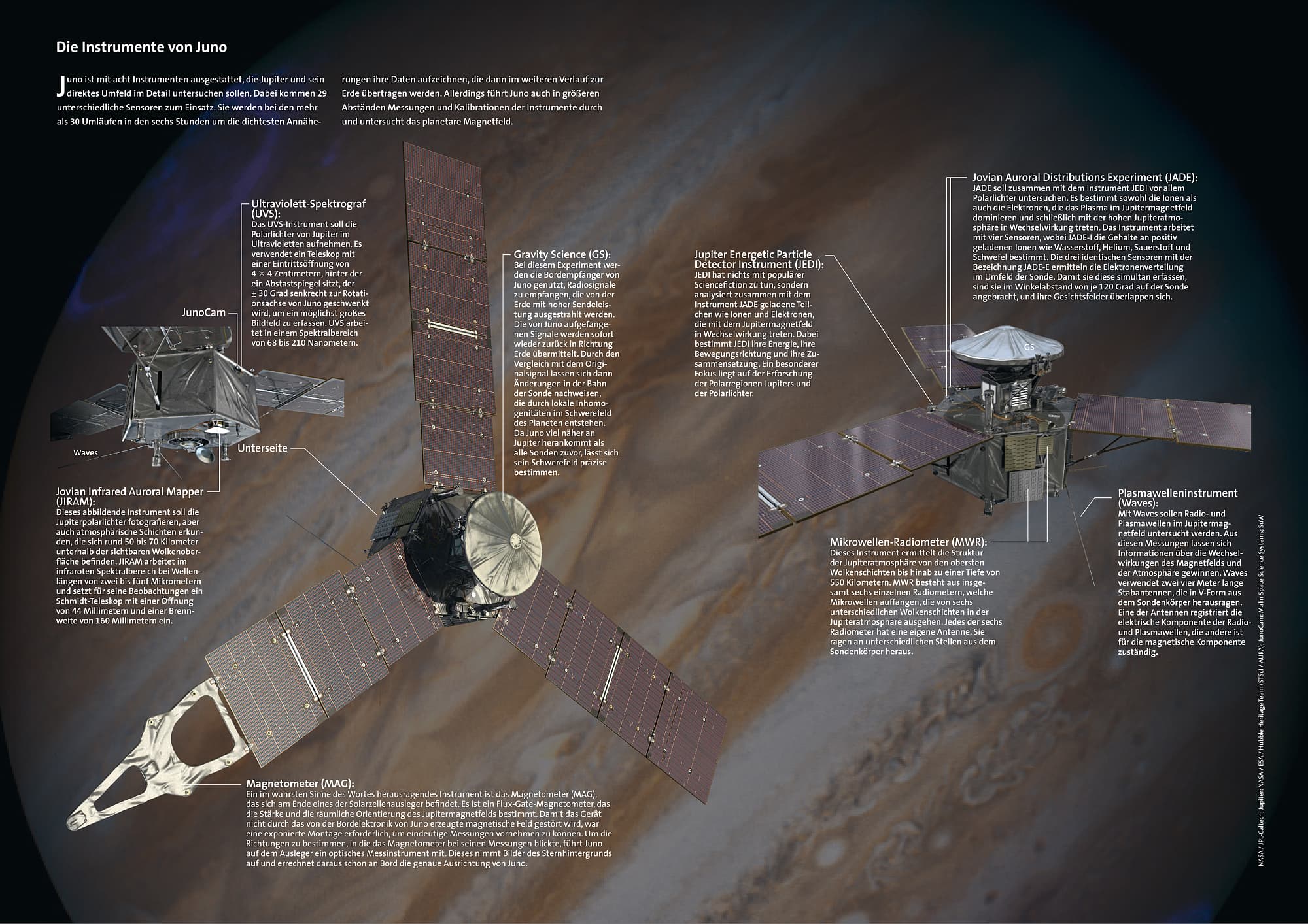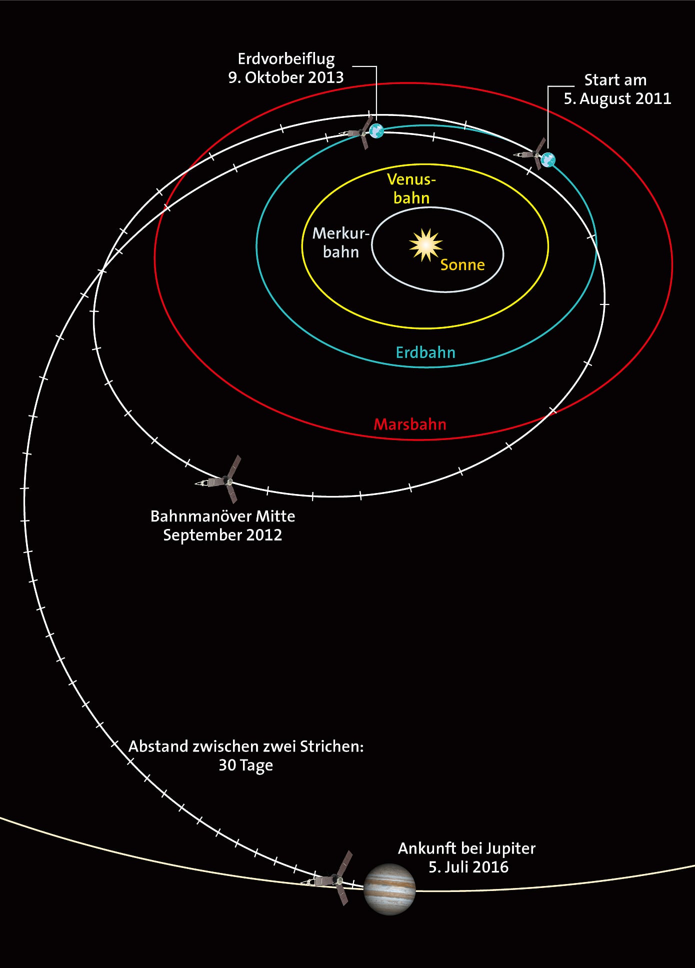 Nach 13 Jahren Pause wird mit Juno, benannt nach der Gattin des römischen Göttervaters Jupiter, wieder eine Raumsonde den größten Planeten des Sonnensystems aus unmittelbarer Nähe und über einen längeren Zeitraum hinweg erkunden. Zuletzt kreiste die Sonde Galileo von 1995 bis 2003 um Jupiter. Seitdem war es um den Riesenplaneten ruhig geworden, sieht man einmal von dem kurzen Vorbeiflug der Plutosonde New Horizons im Februar 2007 ab. Juno ist eine hoch spezialisierte Raumsonde, die den Riesenplaneten selbst und sein Magnetfeld mit den extrem starken Strahlungsgürteln von einer polaren Umlaufbahn aus erforschen soll. Anders als die Vorgängermissionen wird sich Juno nicht mit den Jupitermonden befassen.