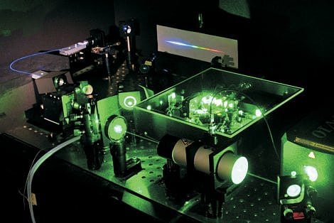 Frequenzkamm-Synthesizer | Grünes Laserlicht liefert die Enrgie für den Titan-Saphir-Laser in der Bildmitte, dessen Licht durch nichtlineare optische Effekte in einer Quarzfaser weiß wird. Ein Gitter zerlegt es in die einzelnen Regenbogenfarben.