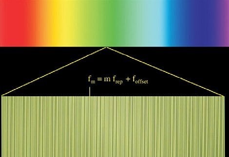 Frequenzkamm | Die Pulse aus einem Frequenzkamm-Laser bestehen aus sehr schnellen Schwingungen, die keine Elektronik auflösen kann. Die scharfen Frequenzbänder ähneln den Zinken eines Kamms – daher der Name "Frequenzkamm".