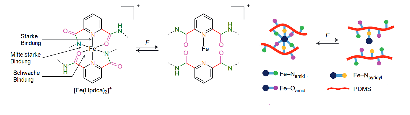 Schwache Bindungen dagegen, die sich bereitwilliger umlagern, lassen das Molekül instabil werden. Die so genannten Wasserstoffbrückenbindungen zum Beispiel, die sich im Prinzip leicht lösen und wieder verschließen lassen, sind leider empfindlich gegenüber Feuchtigkeit. Eine Arbeitsgruppe US-amerikanischer und chinesischer Wissenschaftler stellt nun einen Lösungsansatz für das Problem vor. Das Team nutzt die Affinität vieler stickstoff- und sauerstoffhaltiger Moleküle zu Eisen. Organische Stoffe und Metalle bilden oft so genannte Komplexe, in denen sich koordinative Bindungen zwischen Metall und einzelnen Atomgruppen bilden. Diese können sich lösen und wieder bilden, ohne dass man dazu das ganze Molekülgerüst umbauen muss.