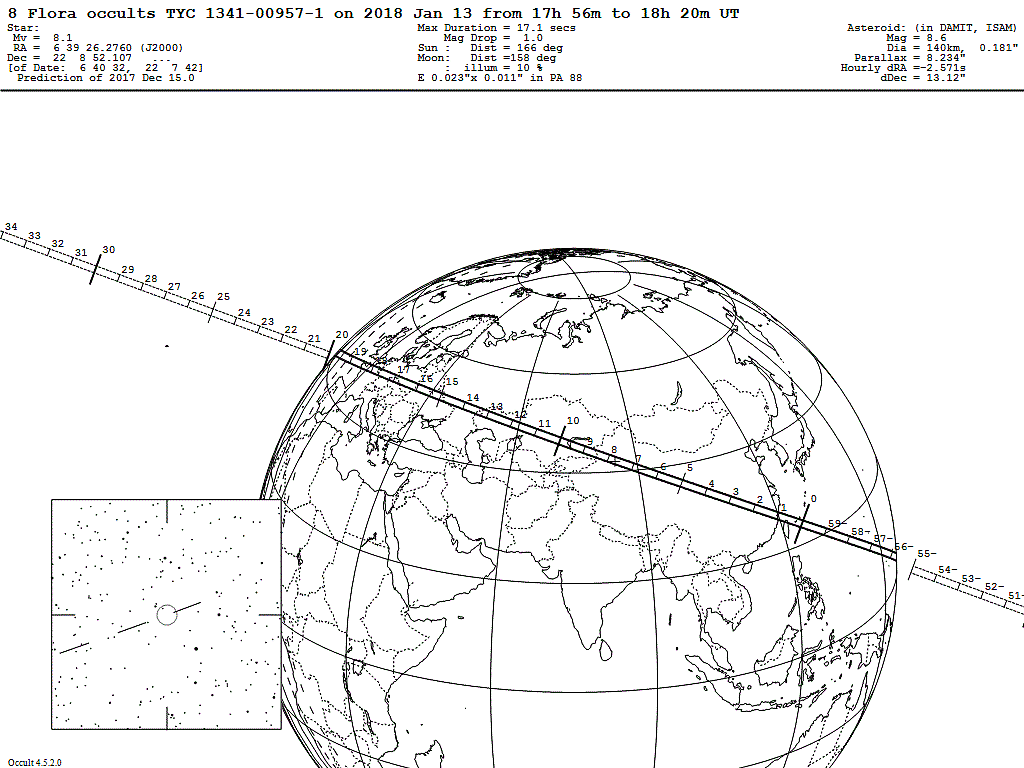 Die zweite Sternbedeckung ereignet sich am 13. Januar. Dann wird der Asteroid (8) Flora den Stern IRAS 06364+2211 im Sternbild Zwillinge für mehr als 17 Sekunden bedecken. Das ist extrem lang für eine Sternbedeckung durch einen Asteroiden, die sonst nur wenige Sekunden andauern. Dafür ist der Helligkeitsabfall mit nur einer Magnitude relativ wenig, denn der Stern ist mit 8,1 mag nur wenig heller als (8) Flora. Der Stern IRAS 06364+2211 ist zwischen den Füßen der Zwillinge zu finden. Der Bedeckungspfad führt über ganz Asien von China bis zur Ukraine und dann weiter über Mitteldeutschland bis Nordfrankreich. Die Sternbedeckung kann zwischen 19:17 und 19:18 Uhr MEZ beobachtet werden. Beide Sternbedeckungen lassen sich leicht in relativ kleinen Amateurteleskopen sehen.