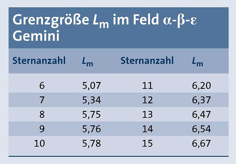 Tabelle für die Vergleichssterne in den Zwillingen | Wenn Sie im Dreieck der Sterne alpha-beta-epsilon Gemini im Sternbild Zwillinge soviele Sterne wie angegeben mit dem bloßen Auge sehen, können Sie die Grenzgröße an ihrem Beobachtungsstandort ablesen.