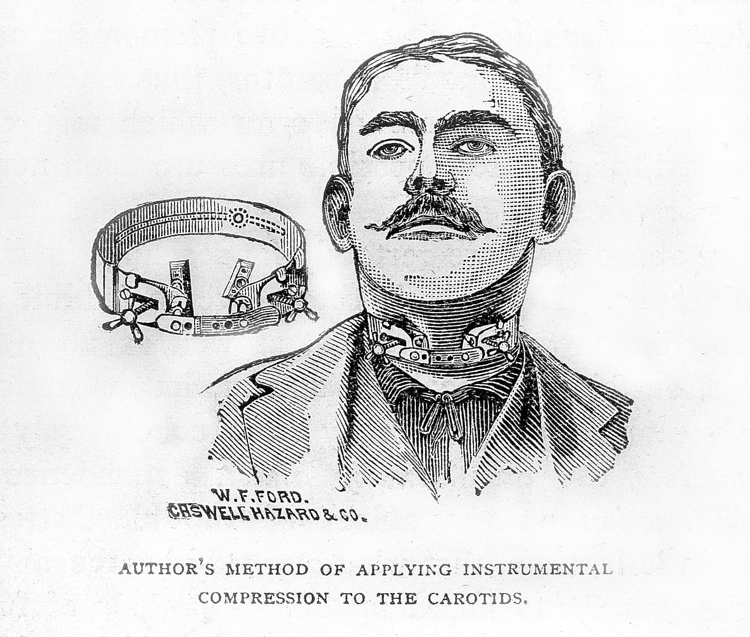 Die Geschichte der Vagusnervtherapie beginnt bereits in den 1880er Jahren. Damals entwickelte der New Yorker Neurologe James Leonard Corning (1855–1923) mehrere Instrumente zur Kompression der Halsschlagader, etwa ein gabelförmiges (die »Karotisgabel«) sowie ein gürtelartiges zur Umklammerung des Halses (der »Karotisbinder«, siehe Zeichnung).