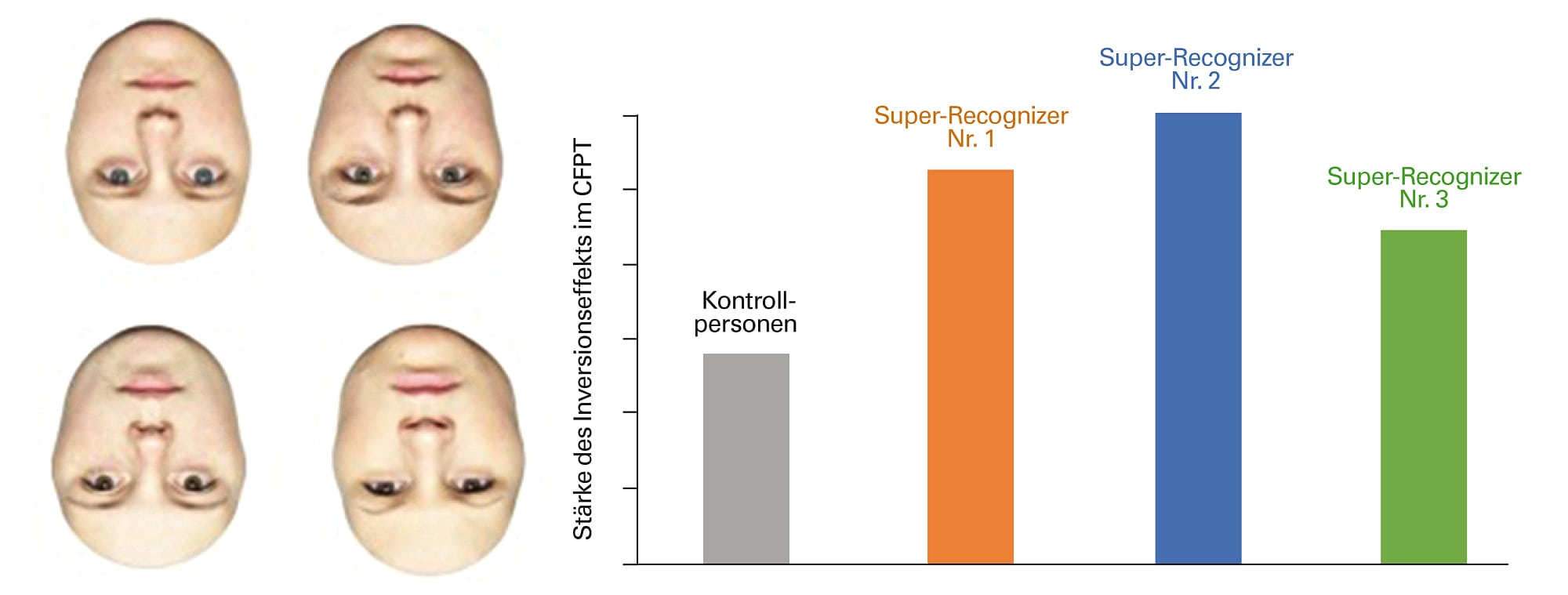 Was läuft bei Super-Recognizern während der Gesichtserkennung im Gehirn anders? Erste empirische Hinweise stammen aus Verhaltensstudien zur Gesichtswahrnehmung. Beispielsweise beschreibt der Inversionseffekt das Phänomen, dass die meisten Menschen Gesichter besser unterscheiden und erkennen können, wenn diese aufrecht und nicht auf dem Kopf stehen (siehe »Der Inversionseffekt«. Interessanterweise zeigen Prosopagnostiker keine orientierungsabhängigen Leistungsunterschiede. Bei einigen Super-Recognizern hingegen ist der Inversionseffekt überdurchschnittlich stark ausgeprägt, wie wir an der Bournemouth University herausfanden. Für den Menschen (abgesehen vom Prosopagnostiker) ist ein Gesicht immer mehr als die Summe aller Teile. Super-Recognizer jedoch integrieren die Gesichtsinformationen vielleicht in einem noch viel stärkeren Ausmaß.
