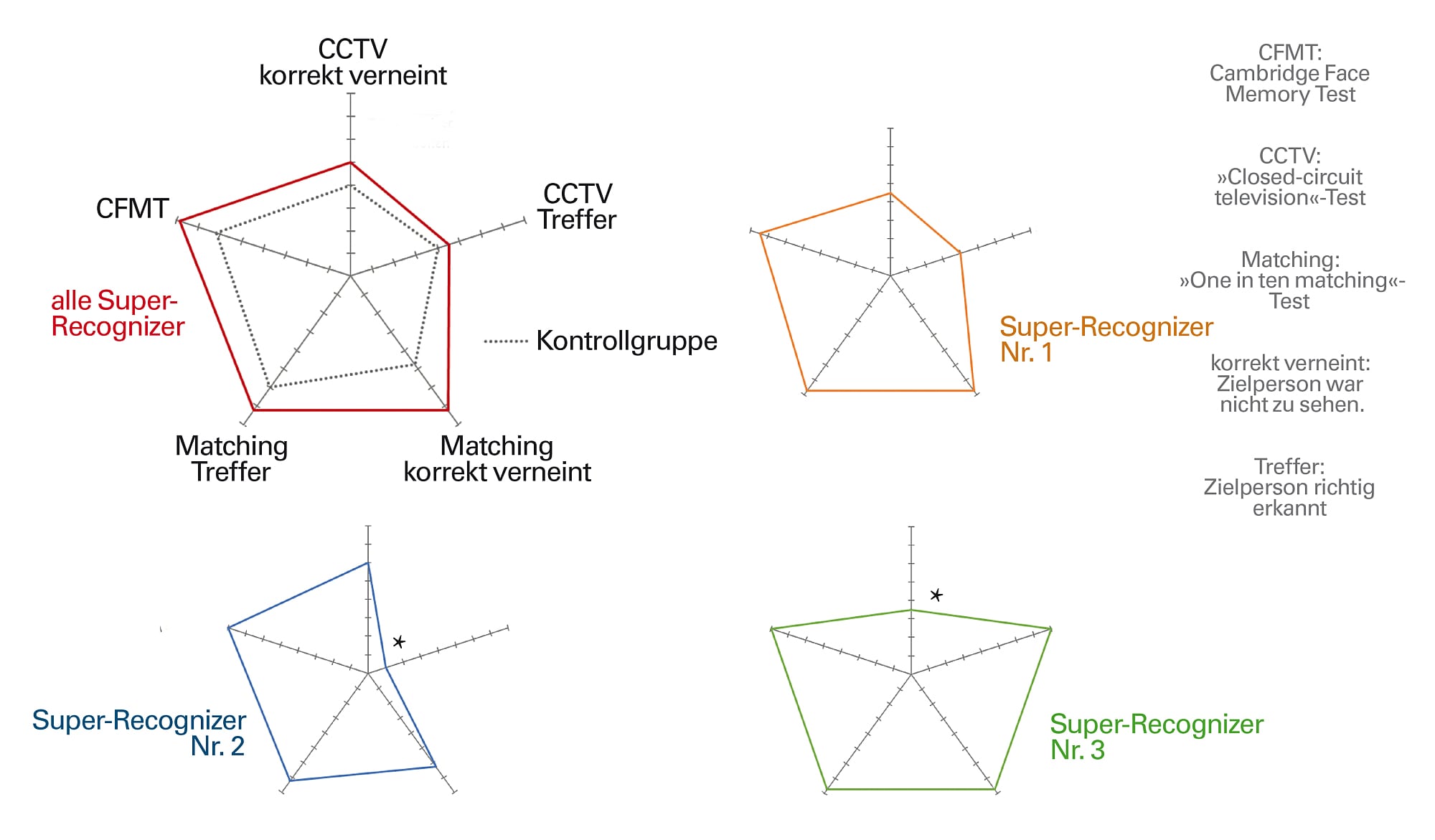 Nach den bisherigen Ergebnissen zeigen Super-Recognizer eher durchschnittliche Leistungen in den Bereichen Empathie, Intelligenz, Gedächtnis und allgemeiner Wahrnehmung. Sie sind demnach nicht etwa mit Gedächtnissportlern zu vergleichen und besitzen wohl weder herausragende intellektuelle Gaben noch besondere visuelle Fähigkeiten. Lediglich was die Gesichtserkennung angeht, fallen sie zuverlässig aus dem Raster. Dies bestätigte eine 2016 publizierte Studie von Arbeitsgruppen (Anna Bobak) an den Universitäten von Bournemouth und Stirling. In einem neu entworfenen Experiment sollten sich die Probanden zunächst Porträts von 20 Personen einprägen – dabei hatten sie für jedes Bild nur fünf Sekunden Zeit. Anschließend mussten sie bei 40 ebenso kurzen Videoclips angeben, ob sie einen der Gezeigten wiedererkennen. Nur in der Hälfte der Filme kamen die Zielpersonen überhaupt vor. Die Videos waren zudem bei normaler Raumbeleuchtung aufgenommen und besaßen jene Qualität, die für Überwachungskameras typisch ist (siehe »Zielsicher wiedererkannt«). Tatsächlich gelang den Super-Recognizern die Identifizierung noch mit einer Treffsicherheit von 67 Prozent und damit um knapp neun Prozent besser als den Kontrollpersonen.