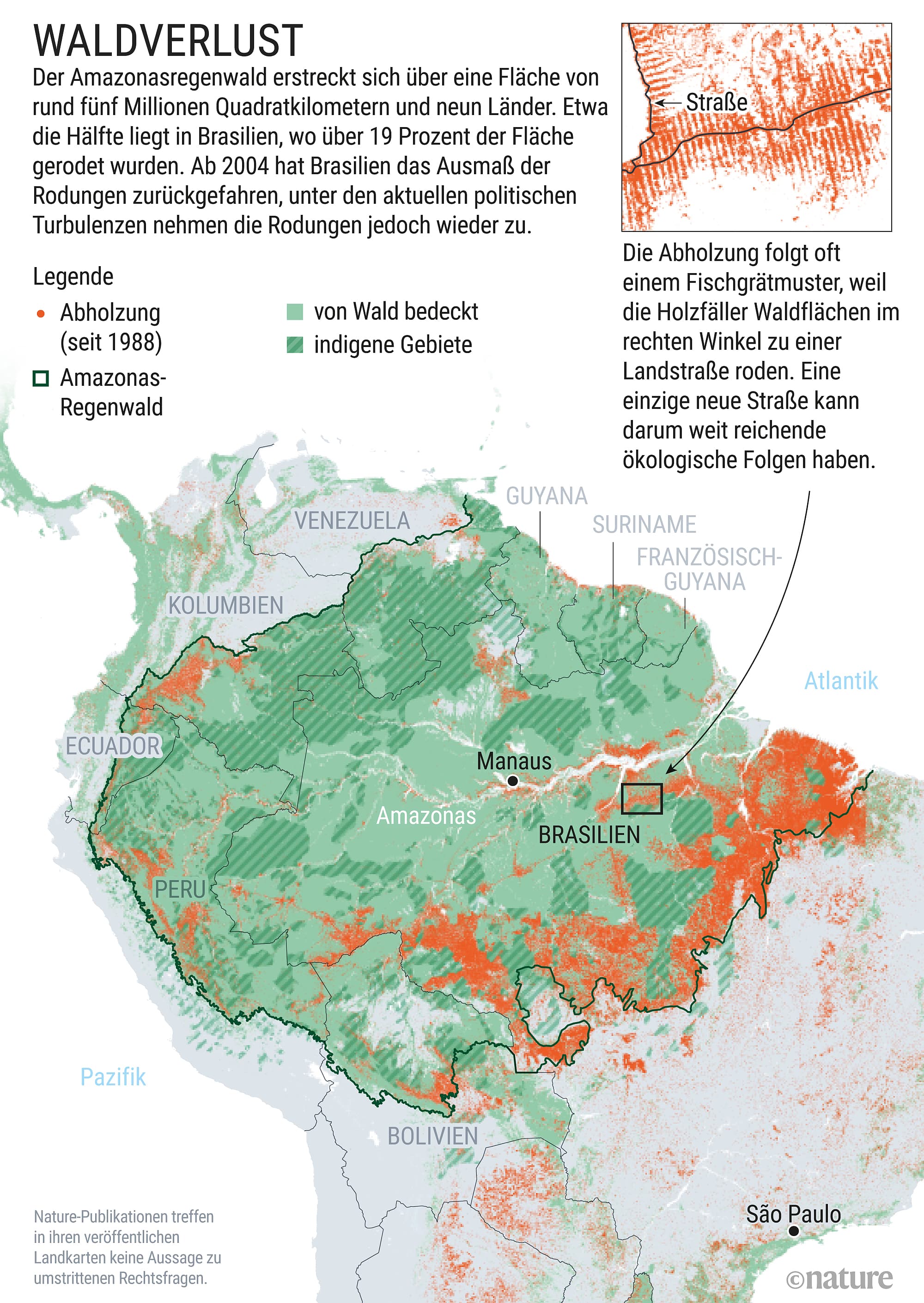 Anfang Februar 2020 unterzeichneten mehr als 1000 Wissenschaftler einen offenen Brief, in dem sie davor warnten, dass »die Regierung von Präsident Jair Bolsonaro die Sozial- und Umweltpolitik des Landes demontiert«. »Es ist eine Notsituation«, sagt Adriane Esquivel Muelbert, Ökologin an der University of Birmingham, Großbritannien, und eine der Unterzeichnerinnen des Briefes. »Wir können das Problem lösen, aber wir müssen jetzt handeln.«
