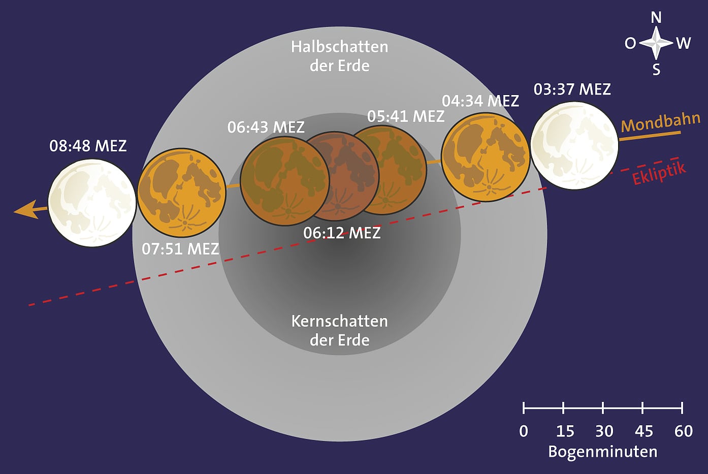 Innerhalb von rund einer Stunde verwandelt sich der zunächst noch gleißend helle runde Vollmond zu einer Sichel, und schließlich bleibt nur noch ein dunkelrotes Glimmen seiner Scheibe übrig: Die Totalität hat begonnen. Nun ist im Fernglas gut zu erkennen, dass der südlich des Monds gelegene zentrale Bereich des Kernschattens dunkler ist als seine Randbereiche.
