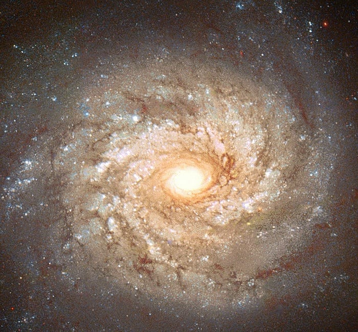 Eine typische Spiralgalaxie | Spiralgalaxien sind scheibenförmige, rotierende Sternsysteme. Sterne und Gas in den äußeren Bereichen sollten nur noch wenig der Schwerkraft erfahren, die von der massereichen inneren Region ausgeht. Zum Rand hin sollte die Materie daher immer langsamer um das Zentrum kreisen. Dies ist jedoch kaum der Fall, was zu Spekulationen um zusätzliche Schwerkraft und letztlich versteckte Dunkle Materie führte.
