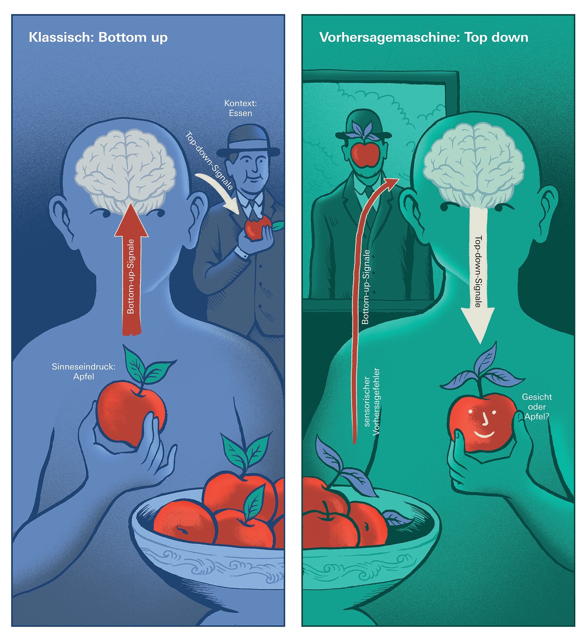 Um zu verstehen, wie dramatisch eine solche Sichtweise unsere intuitiven Vorstellungen von den neurobiologischen Grundlagen der Wahrnehmung auf den Kopf stellt, muss man sich die Richtung der Signalströme im Gehirn vergegenwärtigen: Wenn wir die Wahrnehmung für ein direktes Fenster zu einer äußeren Realität halten, erscheint es logisch, dass Informationen von den Sinnesorganen zum Gehirn fließen, also von unten nach oben (bottom up). Umgekehrt gerichtete Signale könnten lediglich Zusammenhänge oder Verfeinerungen des Wahrgenommenen beisteuern – mehr nicht. In einer solchen Sichtweise scheint es, als offenbare sich die Welt uns unmittelbar durch unsere Sinne.
