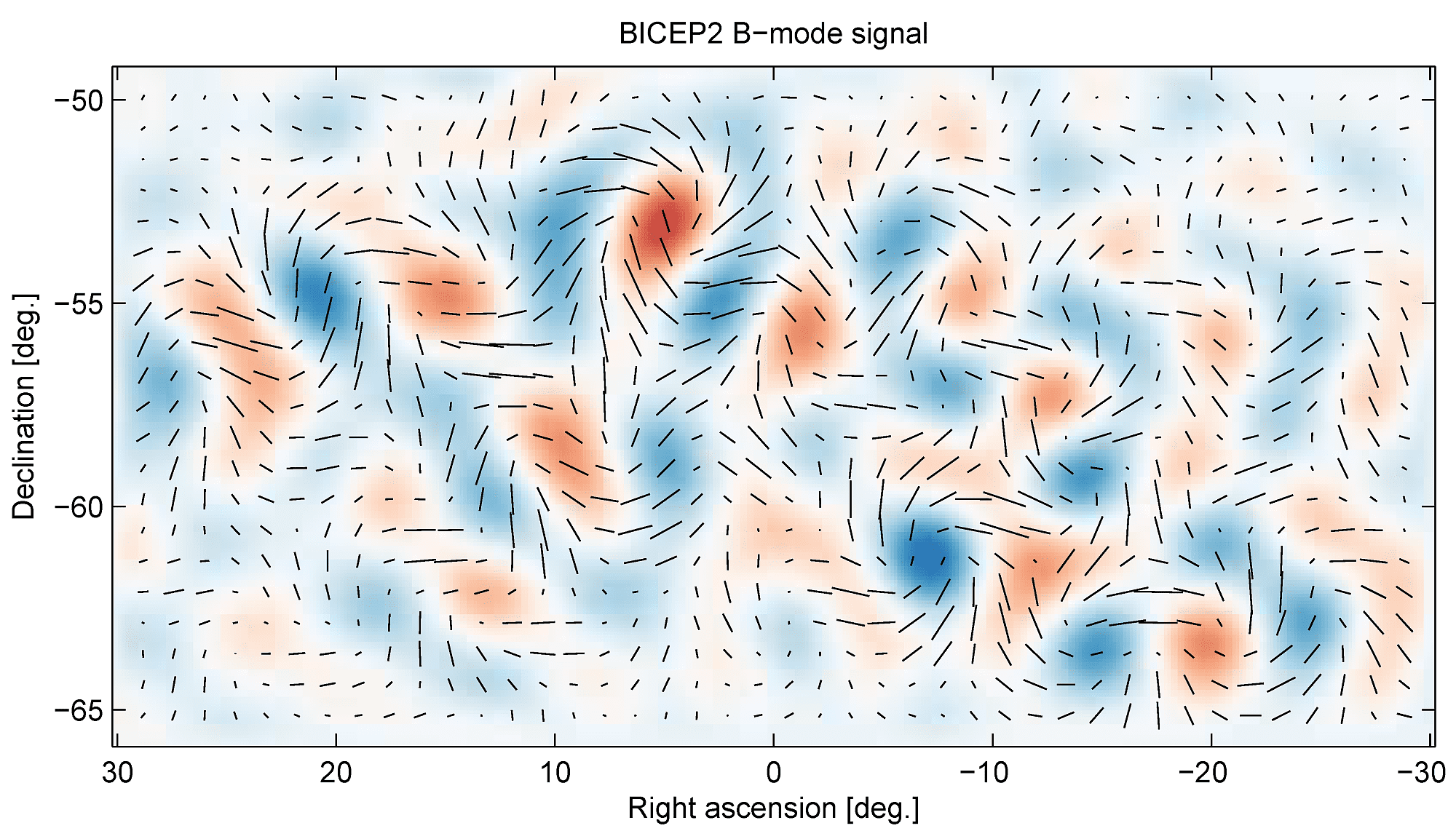 Die Mitglieder des BICEP2-Teams waren nun auf der Suche nach B-Moden in der Polarisation der kosmischen Hintergrundstrahlung, die von Gravitationswellen aus der inflationären Phase des Universums herrührten. Diese Gravitationswellen sollten dem kosmischen Hintergrund eine wirbelartige Struktur der Polarisation aufgeprägt haben. In Veröffentlichungen vom 17. März legten Sie die ersten Belege für einen solchen Nachweis vor.