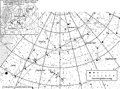Derzeit lassen sich zwei Kometen recht gut am Himmel sichten: Der hellere von ihnen ist 41P/Tuttle-Giacobini-Kresák mit einer Helligkeit von etwas mehr als 7 mag. Er bewegt sich geradewegs durch das Sternbild Drache in Richtung auf die kommenden Sommersternbilder zu. Gegen Ende April tritt der Komet in das Sternbild Herkules ein. Der zweite Komet ist C/2012 V2 Johnson. Er ist mit 9 bis 10 mag deutlich leuchtschwächer als 41P, aber lässt sich mit einem Teleskop noch gut sichten. Der Schweifstern ist auch weiter von uns entfernt und bewegt sich deshalb viel langsamer am Himmel als 41P. Er zieht eine annähernd gerade Bahn vom Herkules in Richtung des Bärenhüters (lateinisch: Bootes).