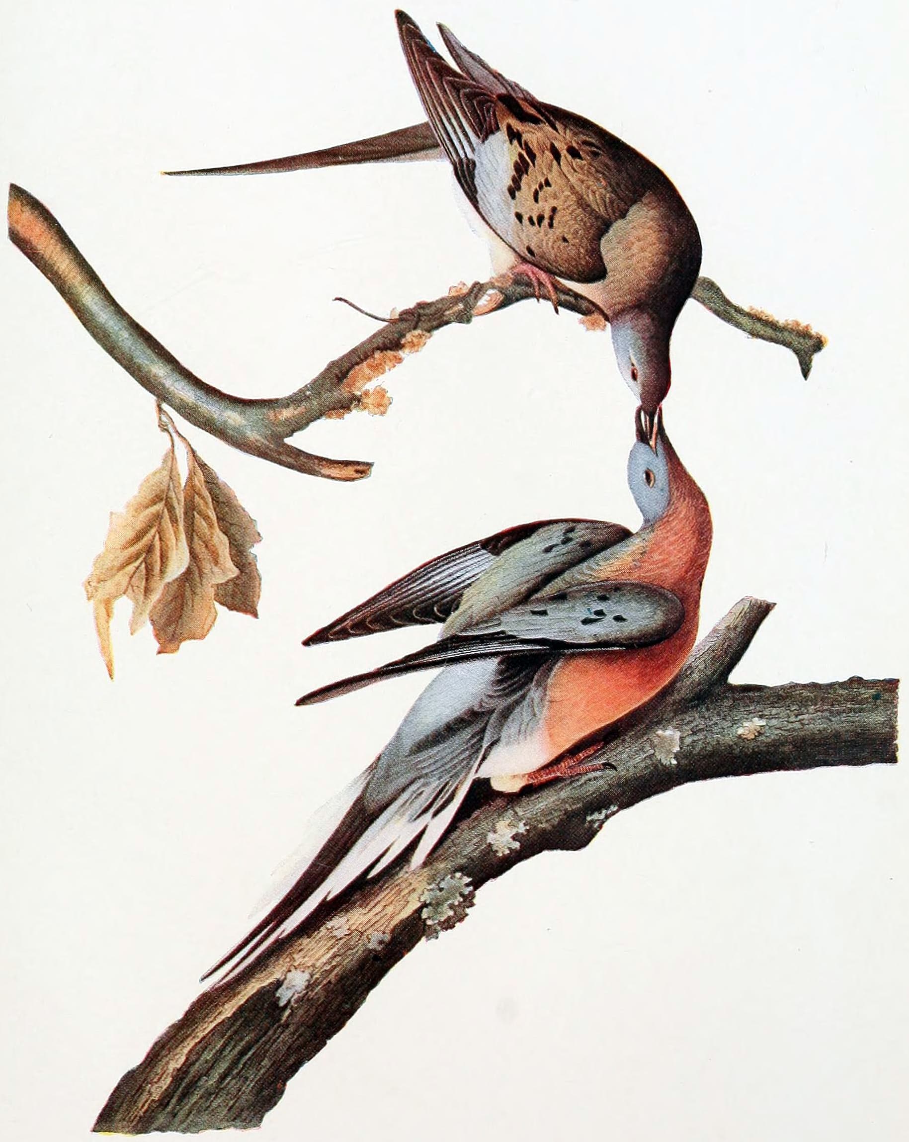 Einen weiteren und letztlich fatalen Schub erlebte die Wandertaube, als die Europäer die Neue Welt eroberten und dabei die einheimische Bevölkerung durch Krieg und Krankheiten dezimierten. Die Indianer konkurrierten mit den Vögeln um die Samen und jagten die Tiere selbst - ohne diese große Konkurrenz konnten sie die frei gewordenen Ressourcen selbst nutzen und sich weiter vermehren. Das galt allerdings nur bis zu einer bestimmten Grenze, denn Milliarden Individuen benötigen gigantische Mengen Futter pro Tag, die nur in so genannten Mastjahren geliefert wurden: Dann produzieren die Bäume massenhaft Eicheln oder Bucheckern, um die Chance zu erhöhen, dass einzelne Sämlinge schließlich durchkommen. Audubon schätzte, dass der von ihm beobachtete Schwarm pro Tag etwa 307 000 Kubikmeter Nüsse und Samen verzehren musste - eine unvorstellbare Menge, die anschließend natürlich auch wieder ausgeschieden wurde.