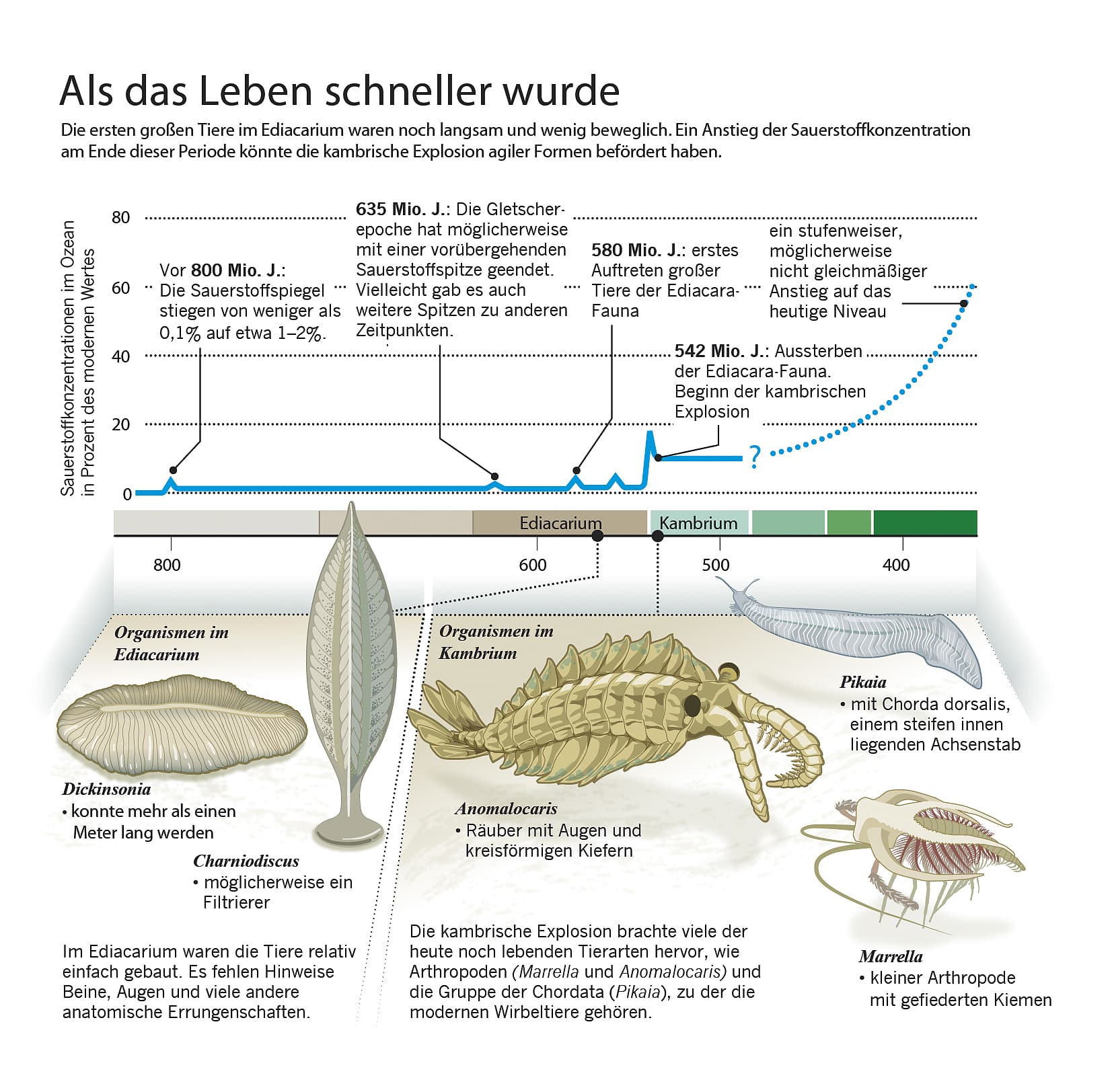 Immer mehr Hinweise auf Schwellenwerte und Ökologie des Sauerstoffs könnten die Forscher nun auch bei einer ganz anderen wichtigen Frage der Evolution weiterbringen: Wann sind die Tiere überhaupt entstanden? Die ersten eindeutigen Tierfossilien tauchten vor nur 580 Millionen Jahren auf; allerdings deuten Befunde aus der Genetik darauf hin, dass grundlegende Tiergruppen bereits vor 700 oder 800 Millionen Jahren entstanden sein müssen. Als möglichen Auslöser nennt Lyons einen Anstieg des Sauerstoffgehalts vor 800 Millionen Jahren auf zwei oder drei Prozent des heutigen Werts. Diese Konzentration könnte für kleine, einfache Tiere ausgereicht haben, genauso wie heutzutage etliche Populationen in den sauerstoffarmen Meereszonen damit gut leben. Doch Tiere mit großen Körpern konnten sich bestimmt erst mit einem Anstieg des Sauerstoffgehalts im Ediacarium entwickeln.