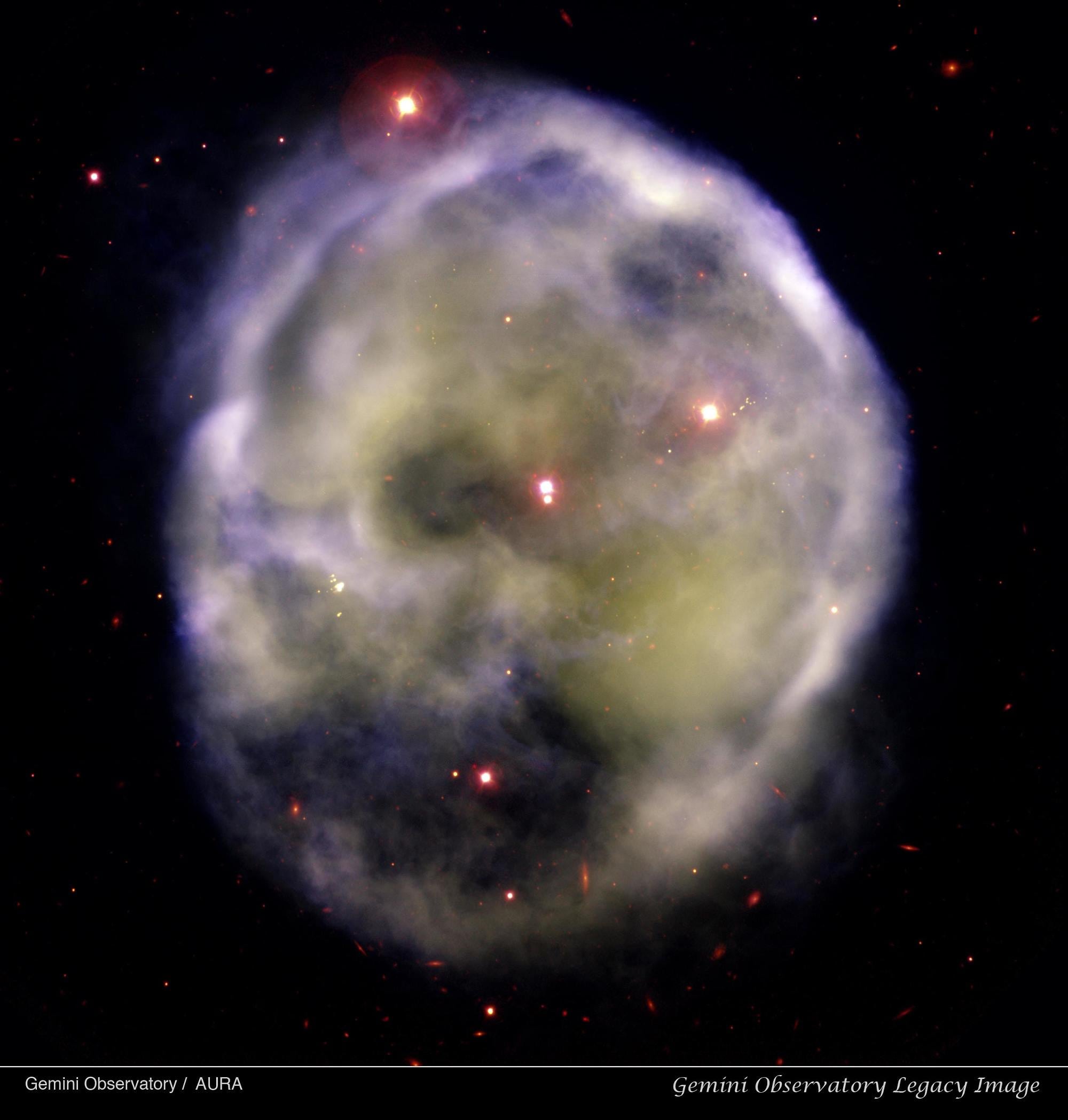 Für Freunde leuchtschwacher Deep-Sky-Objekte kann ich auch wieder einige Planetarische Nebel empfehlen, zum Beispiel den Saturnnebel NGC 7009. Er befindet sich zwischen den Sternbildern Steinbock und dem rechten Arm des Wassermanns neben Ny Aquarii und verdankt wie die meisten Ojekte seiner Art den Namen seiner Form. Dadurch, dass Planetarische Nebel so kompakt sind und in der Regel im Teleskop nicht viel größer als ein Planetenscheibchen erscheinen, meint man, einen kleinen unscharfen Saturn zu sehen. Auch der "Totenkopfnebel" NGC 246 erreicht im Moment etwa drei Stunden später als der Saturnnebel seinen höchsten Stand im Süden. Er steht mitten im Dreieck zwischen den Sternen Beta, Eta und Iota Ceti.