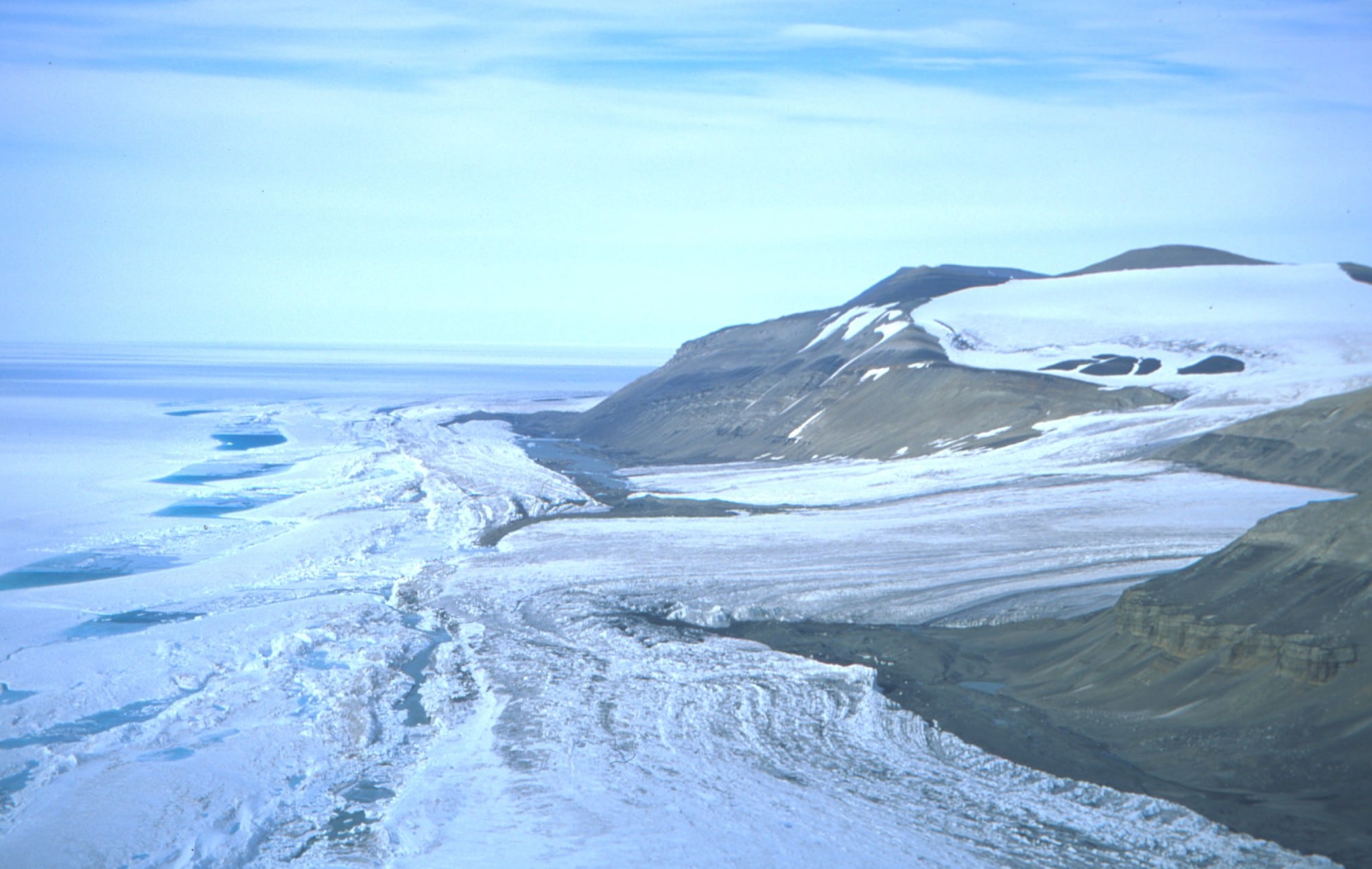 Das George-VI-Eisschelf füllt einen schmalen Kanal zwischen der antarktischen Halbinsel und der vorgelagerten Alexander-Insel und öffnet sich an zwei Fronten zum Ozean – der Gletscher fließt senkrecht zur Achse des Kanals gegen das Ufer der vorgelagerten Insel. Das Schmelzwasser bildet dort, wo das Eis an das gegenüberliegende Ufer brandet, eine Kette von charakteristischen langgezogenen Seen. Satellitenfotos zeigen, dass diese Seenkette mit einer Geschwindigkeit von etwa 500 Meter pro Jahr entlang der Uferlinie nach Norden wandert – etwa drei Mal so schnell wie das Eis selbst, und in einem Winkel von bis zu 60 Grad zu dessen Fließrichtung.