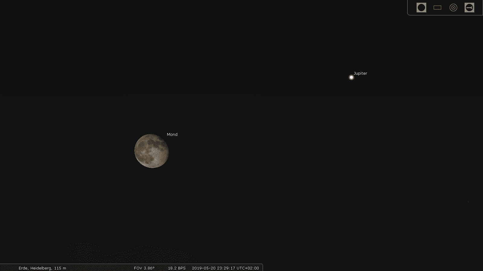 Am 20. Mai begegnet der Mond dem Gasplaneten Jupiter. Die größte Annäherung findet nachmittags statt, wenn die beiden Himmelskörper noch weit unter unserem Horizont stehen. Das Paar geht erst gegen 22:00 Uhr MESZ zusammen am Südosthorizont auf. Sie sind am Himmel nur zwei bis drei Grad voneinander entfernt. Die tatsächliche Entfernung beträgt jedoch mehr als 650 Millionen Kilometer. Jupiter steht außerdem kurz vor der Opposition Anfang Juni. Dabei stehen die Sonne, die Erde und Jupiter in einer Line. Von der Erde aus gesehen, befinden sich also Sonne und Jupiter genau gegenüber. In der Zeit der Opposition und danach sind Planeten stets am besten zu beobachten, da der Abstand zur Erde am geringsten ist und die Planeten immer früher am Abend zu sehen sind. Nur Merkur und Venus können niemals in Opposition stehen, da sie sich innerhalb der Erdbahn aufhalten.