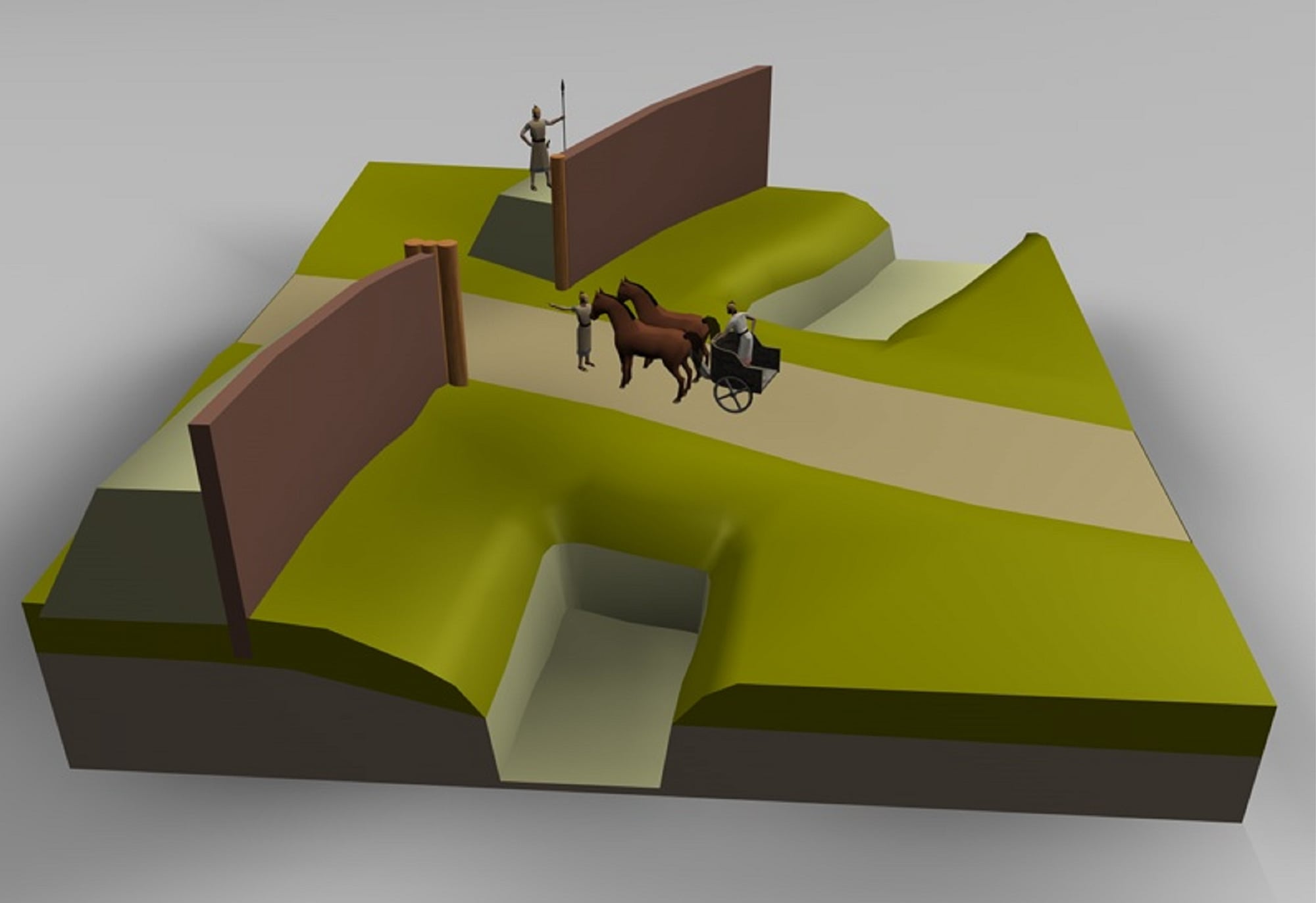 Vermutlich erhob sich dahinter ein Wall, bestehend aus dem Aushubmaterial, der an der Vorderseite wohl durch eine Palisade gesichert war. In einigen ausgegrabenen Partien kamen nämlich Eintiefungen zum Vorschein, mutmaßlich Verankerungen eines hölzernen Tores. Insgesamt wurden drei Zugänge nachgewiesen. In diesen Bereichen war der Graben unterbrochen, was die Deutung als Entwässerungsgraben endgültig widerlegt.